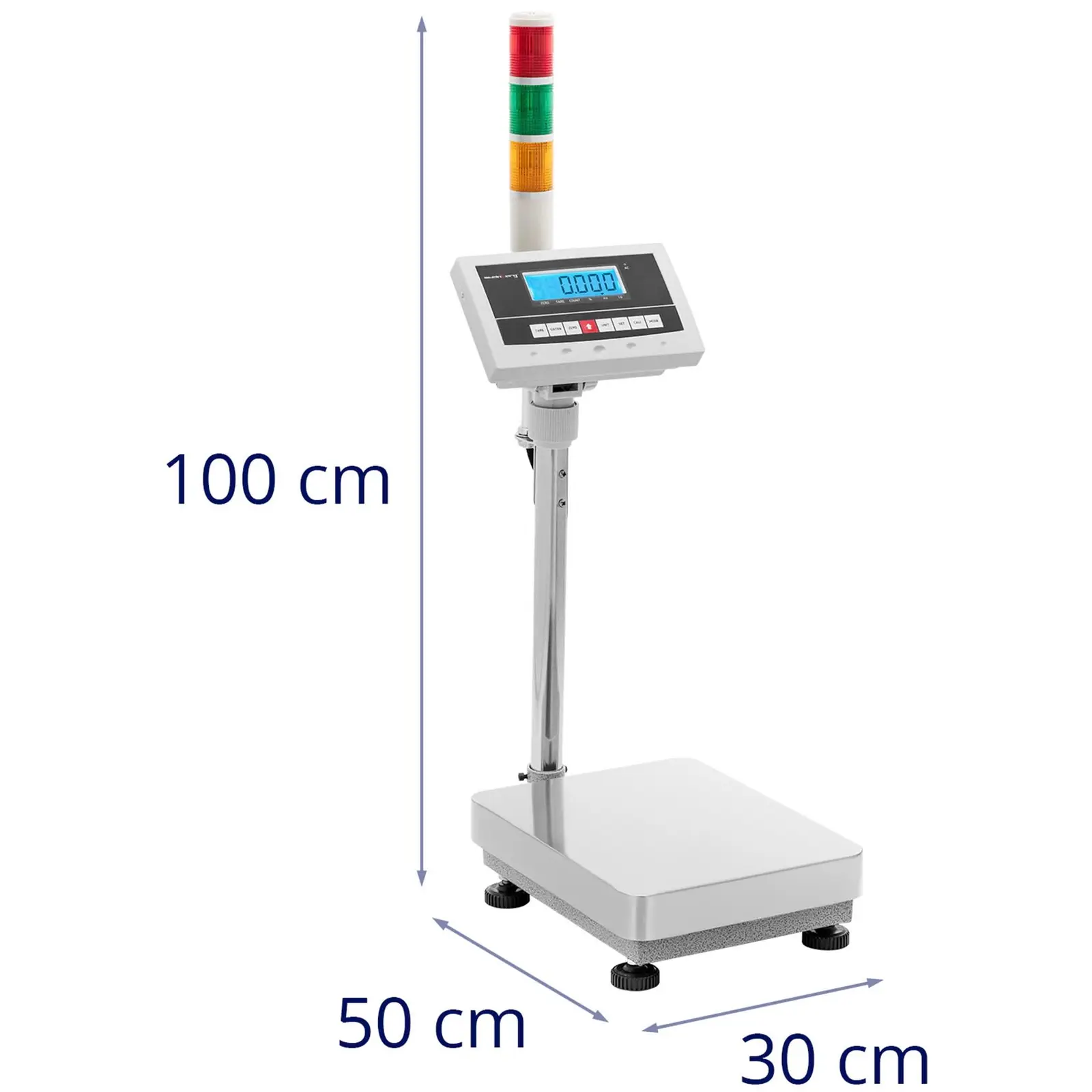 Waga wyposażona jest w 3-kolorową lampkę sygnalizacyjną, która informuje o statusie ważenia: za niska, za wysoka lub w zakresie tolerancji. Można dostosować wartości graniczne, co pozwala na ciągłe monitorowanie. Duży wyświetlacz LCD ze cyframi o wysokości 27 mm zapewnia łatwe odczytywanie wyników.
