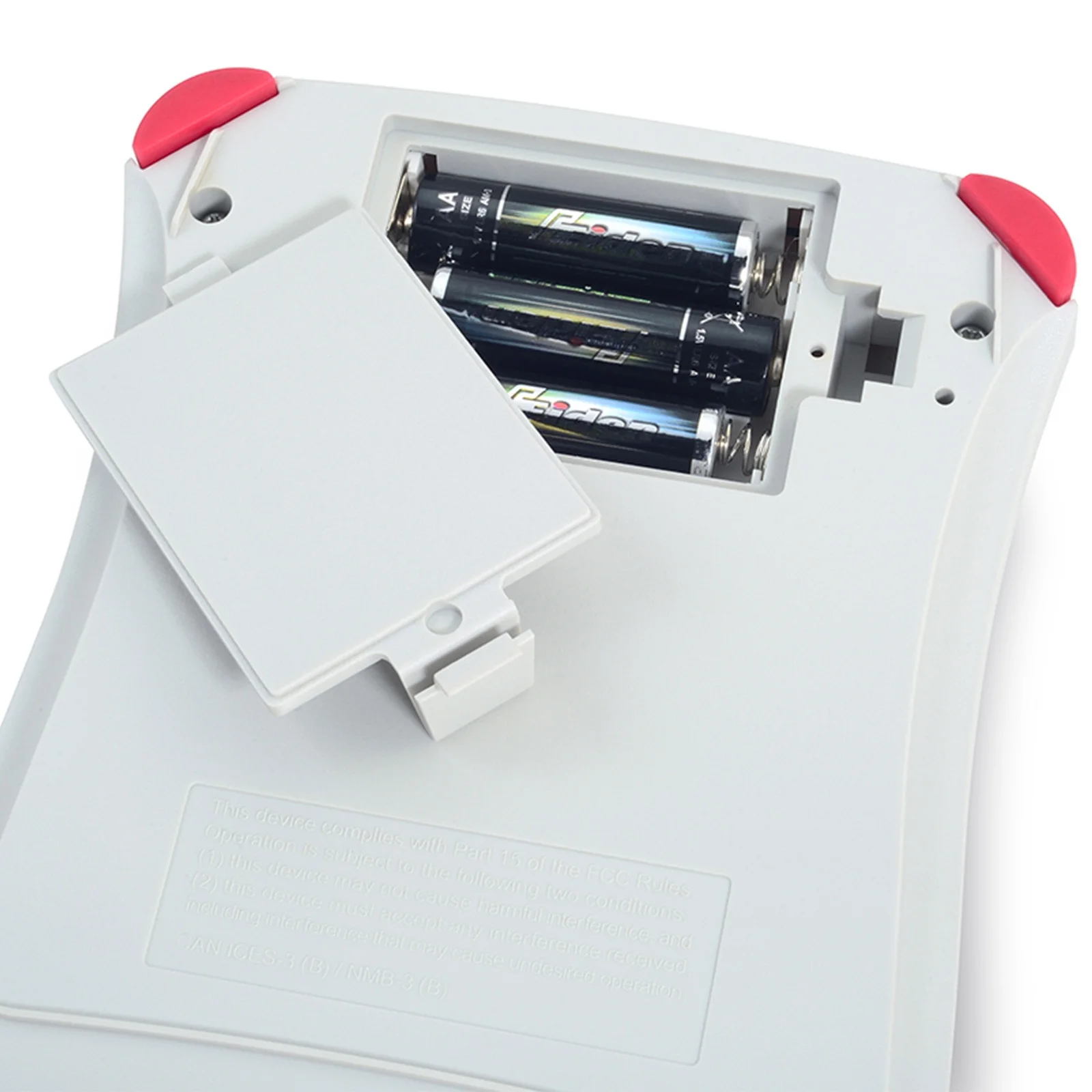 Waga zasilana jest trzema bateriami AA, które zapewniają do 1000 godzin pracy. W zestawie znajdują się baterie rozruchowe, co pozwala na natychmiastowe rozpoczęcie użytkowania. Wymiary to 135 x 201 x 41 mm, a jej masa wynosi 0,5 kg, co sprawia, że jest wygodna w przechowywaniu i transportowaniu.