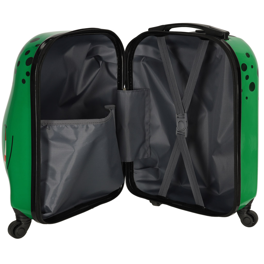 Produkt jest wyposażony w cztery kółka oraz teleskopowy uchwyt, co sprawia, że dziecko bez problemu poradzi sobie z jego prowadzeniem. Walizka została wykonana z wytrzymałego plastiku w zielonym kolorze.