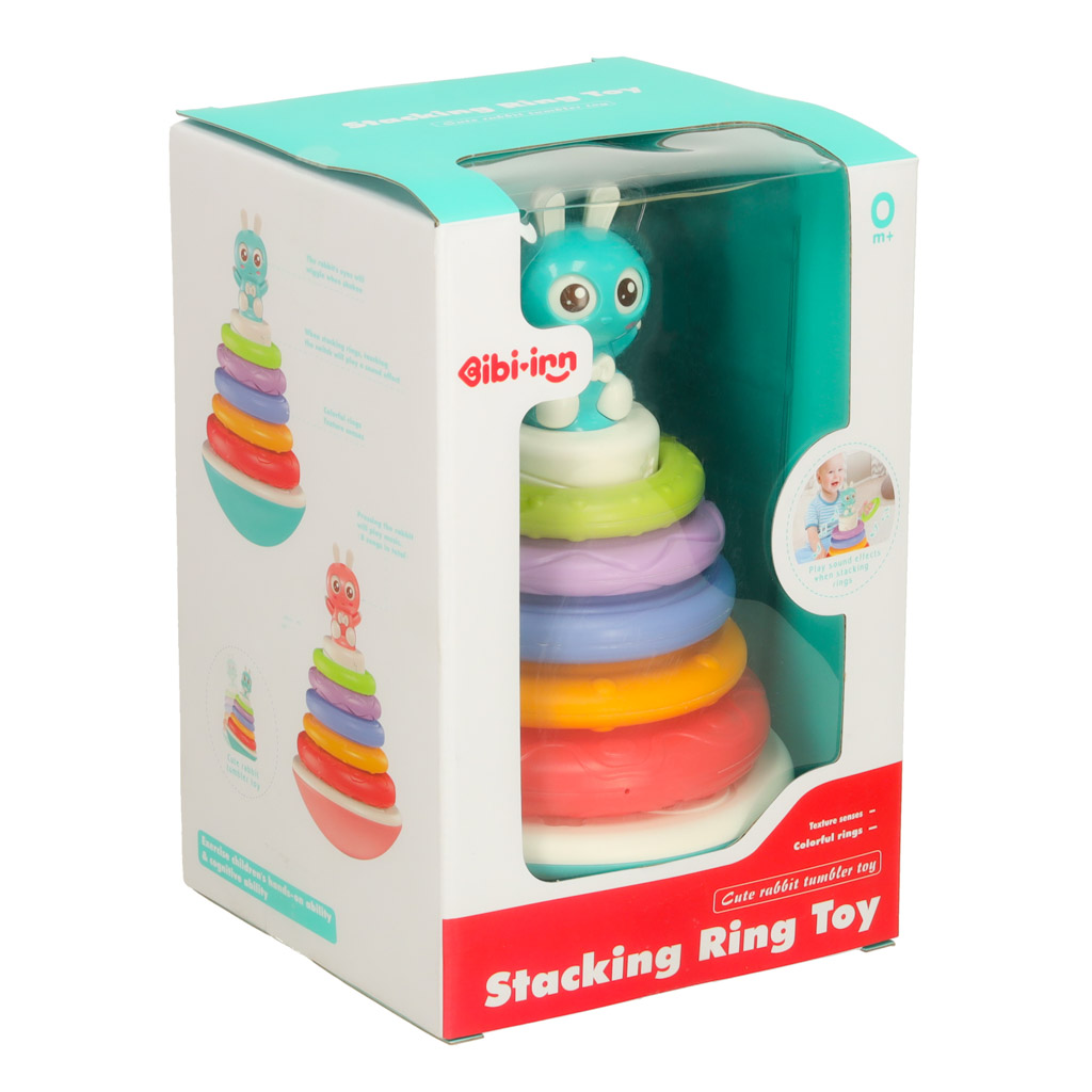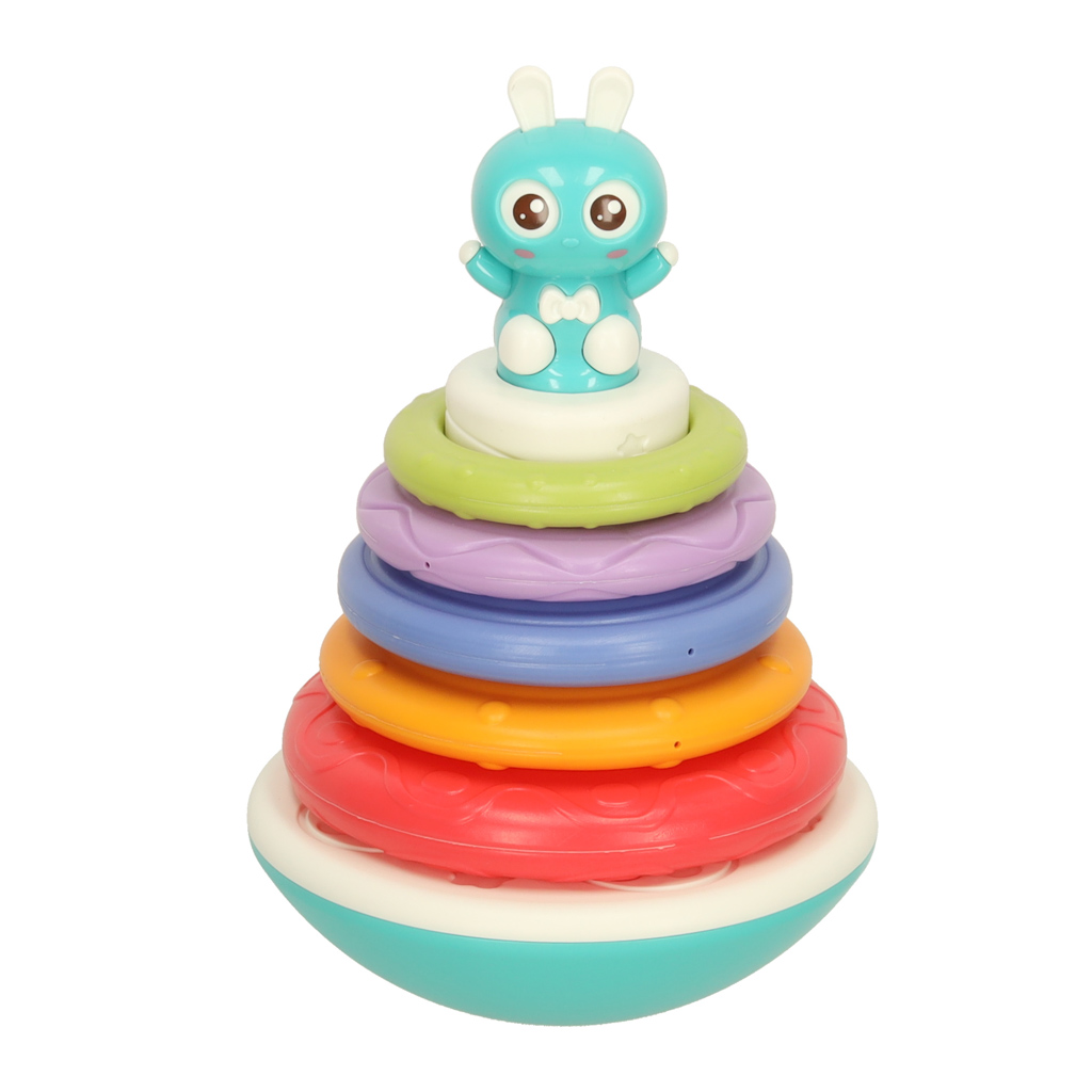 Kolorowa wieża zapewni Twojemu maluszkowi wspaniałą zabawę! Zabawka składa się z bujającej się podstawy z króliczkiem oraz pięciu krążków o różnej wielkości. Zadaniem dziecka jest nałożenie krążków, aby stworzyć tęczową wieżę. Po każdym nałożeniu krążka, zabawka wydaje wesołą melodię, zachęcając do dalszej zabawy.