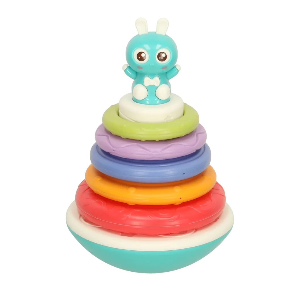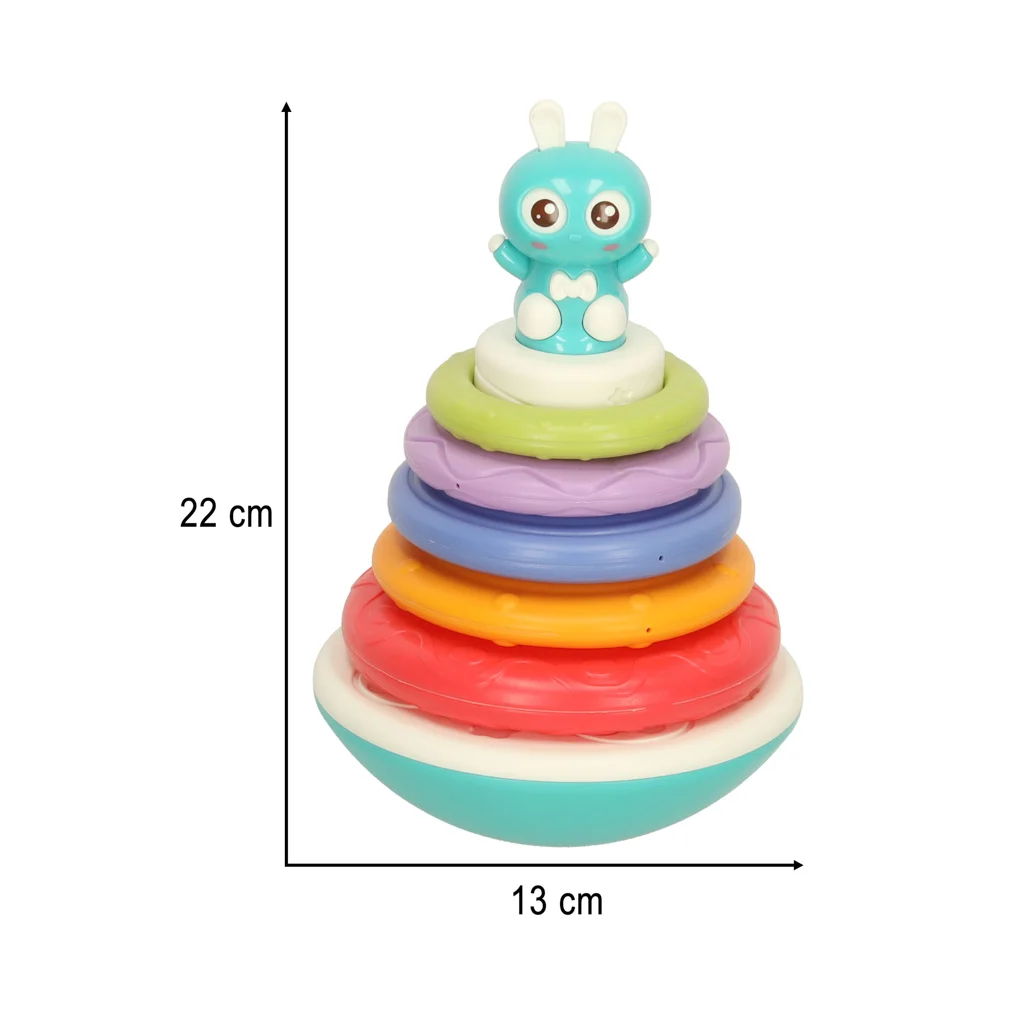 Kolorowa wieża zapewni Twojemu maluszkowi fantastyczną zabawę! Zabawka składa się z bujającej się podstawy z króliczkiem oraz pięciu krążków o różnej wielkości. Zadaniem dziecka jest nałożenie krążków, aby stworzyć tęczową wieżę. Po każdym nałożeniu krążka, zabawka wydaje wesołą melodię, co zachęca do dalszej zabawy.