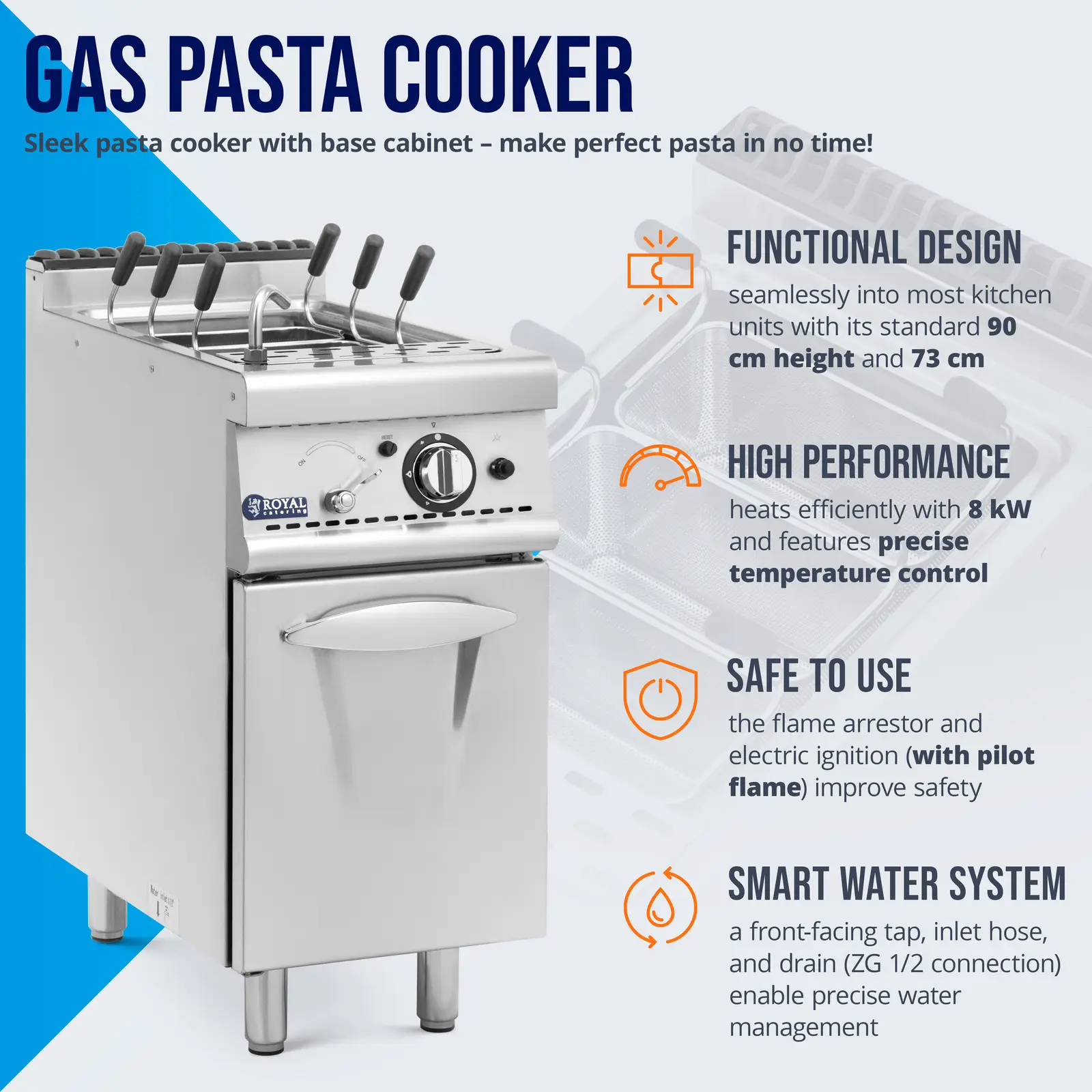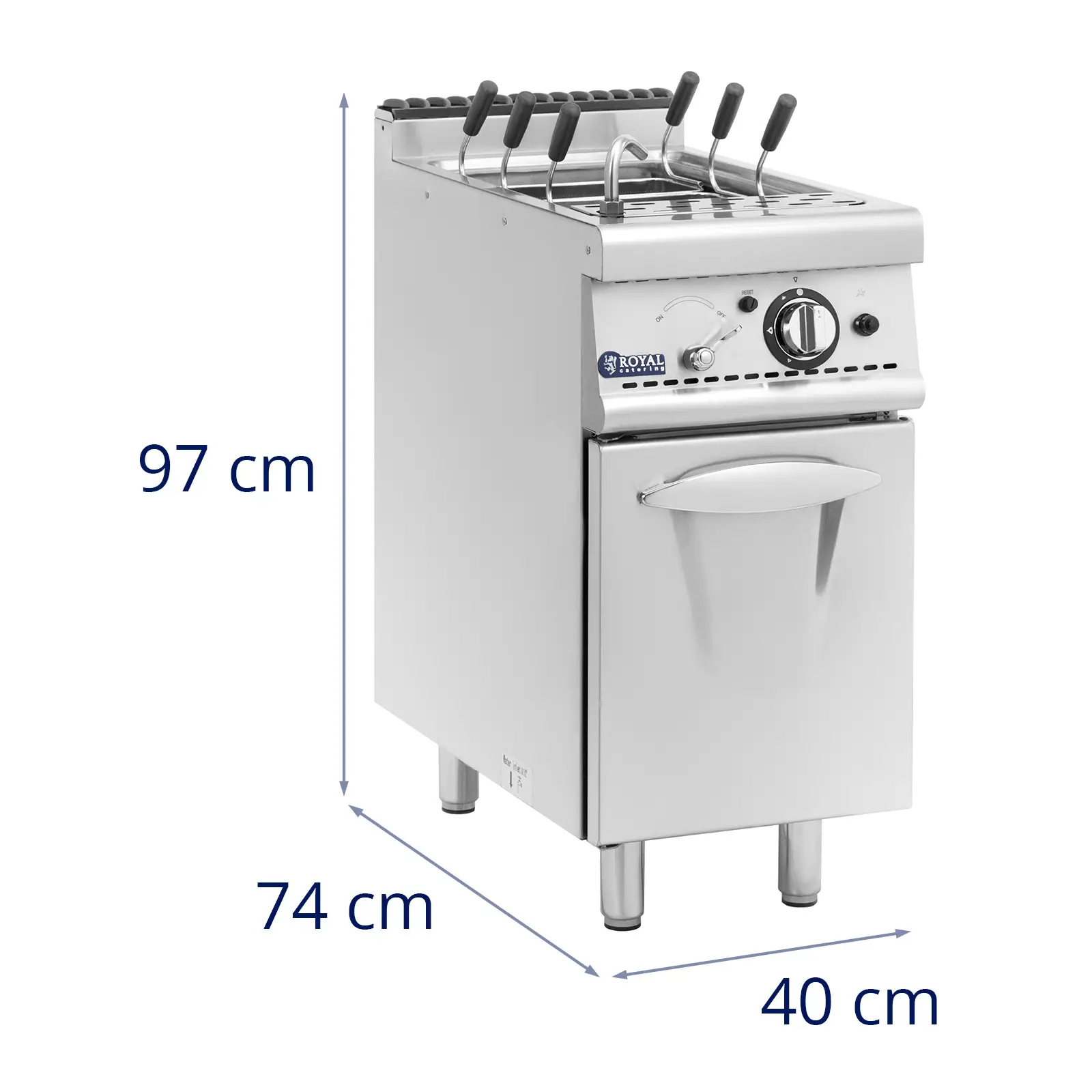 Warnik do makaronu marki Royal Catering to idealne rozwiązanie dla profesjonalnych kuchni. Jego funkcjonalny design oraz przestronna szafka dolna sprawiają, że jest to urządzenie, które ułatwia pracę i organizację w kuchni. Dzięki standardowym wymiarom 90 cm wysokości i 73 cm głębokości, można go łatwo wkomponować w istniejące meble kuchenne.