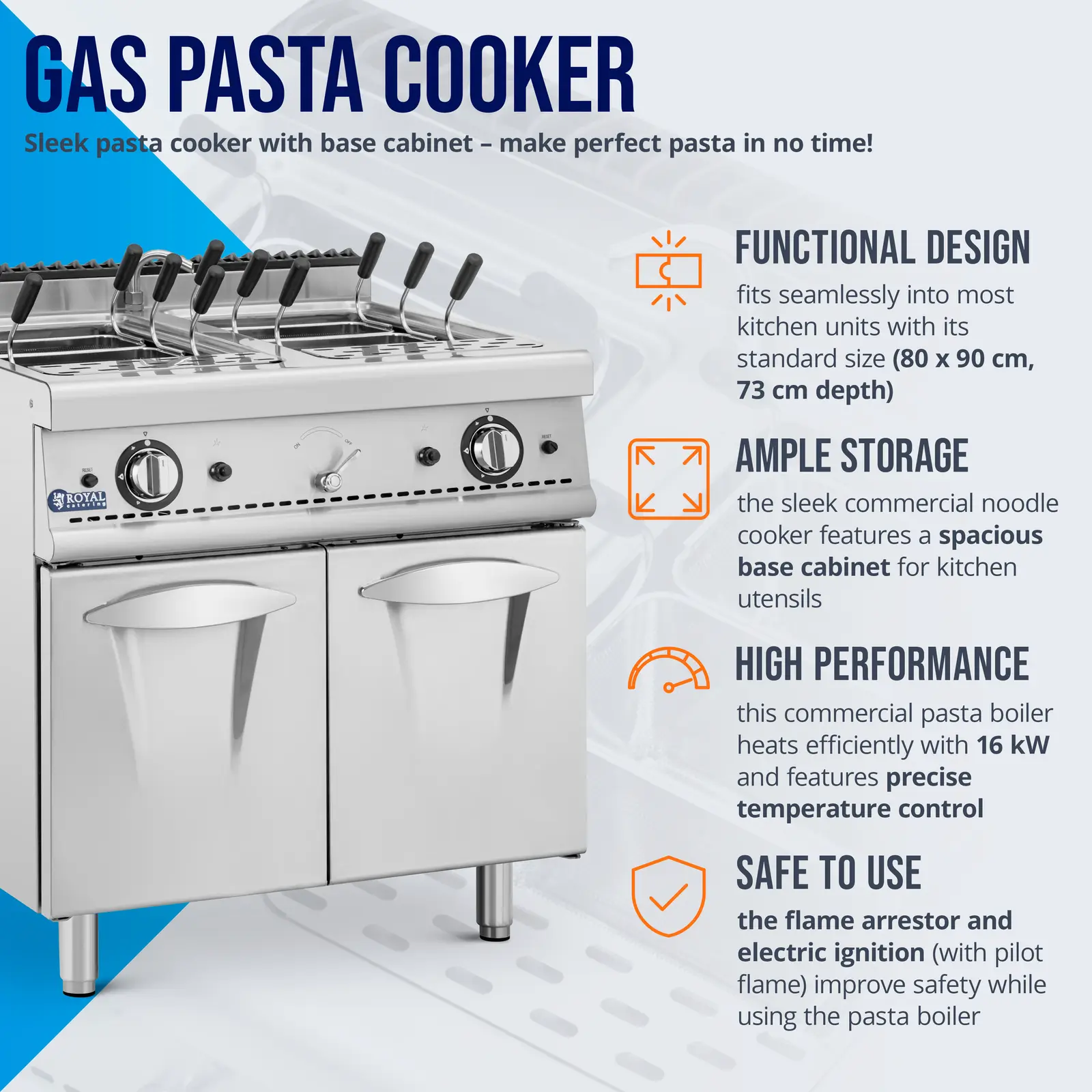 Urządzenie dysponuje mocą 16 kW, co pozwala szybko osiągnąć żądaną temperaturę. Dzięki precyzyjnej kontroli temperatury, można optymalnie przygotować makaron. Zintegrowana blokada płomienia oraz zapłon elektryczny zwiększają bezpieczeństwo pracy. Dodatkowo, kran z przodu oraz wąż dopływowy i odpływ ułatwiają regulację poziomu wody.