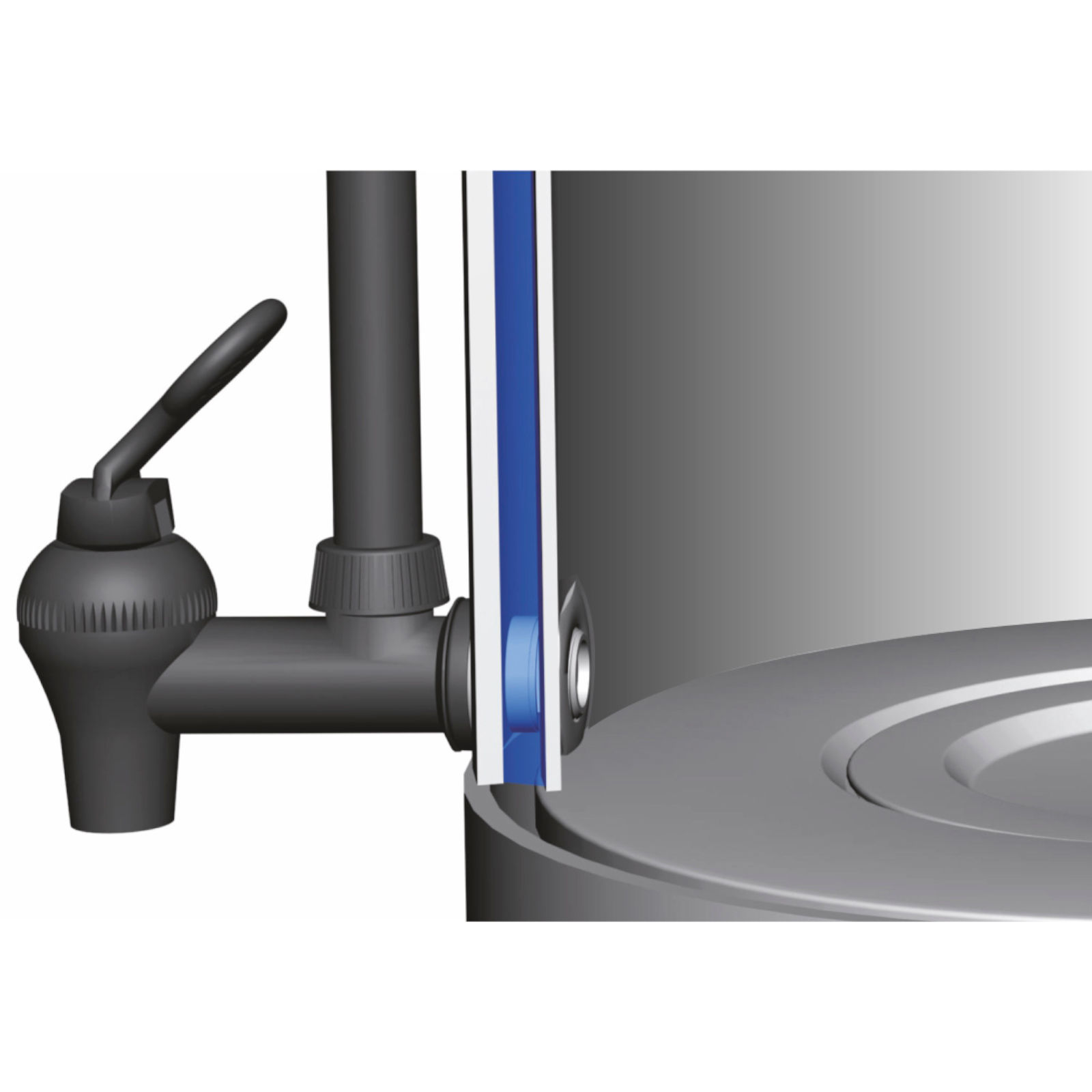 W zestawie znajduje się tacka ociekowa z kratką ze stali nierdzewnej oraz kranik zapobiegający kapaniu, co zapewnia wygodę użytkowania. Wskaźnik poziomu wody umożliwia łatwe monitorowanie ilości płynów w zbiorniku.