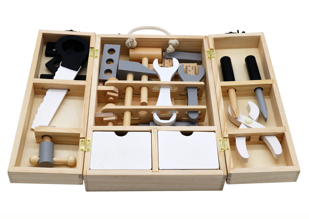 Narzędzia mają czarne rączki i drewniane końcówki. Całość umożliwia wspólną pracę w garażu lub ogródku. Skręcanie, rozkręcanie, majsterkowanie nie będzie już obce. Wyobraźnia pobudzi go do działania i poznawania nowych rzeczy.