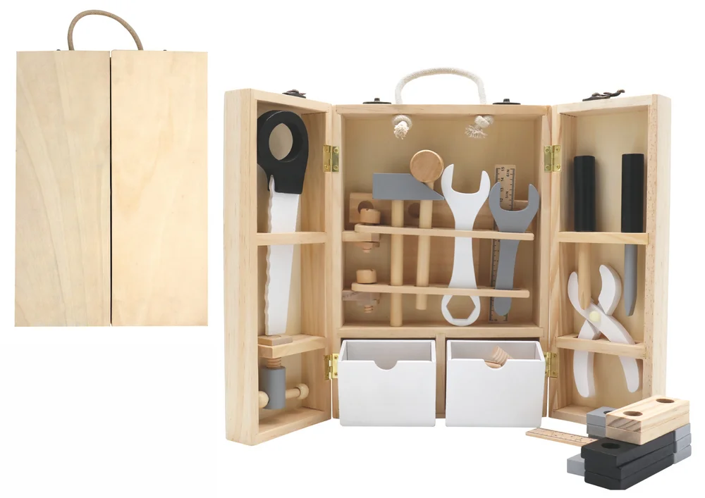 Zabawka jest łatwa w przenoszeniu, można ją również zawiesić na stanie, dzięki uchwytowi na sznurku. Klasyczne drewno oraz jego wytrzymałość sprawiają, że od zawsze cieszy się ono ogromnym uznaniem. Surowiec ten wygląda dobrze zarówno w naturalnym kolorze, jak i pomalowany. W tym przypadku pomalowany jest na szary, czarny i biały. Wewnątrz skrzynki znajdują się odpowiednie szufladki i przegrody, dzięki czemu narzędzia będą poukładane i na swoim miejscu. Można je zabrać również ze sobą, gdzie wspólnie z rówieśnikami możesz naprawiać lub rozkręcać zabawki. Cała walizka jest zamykana na klamry.