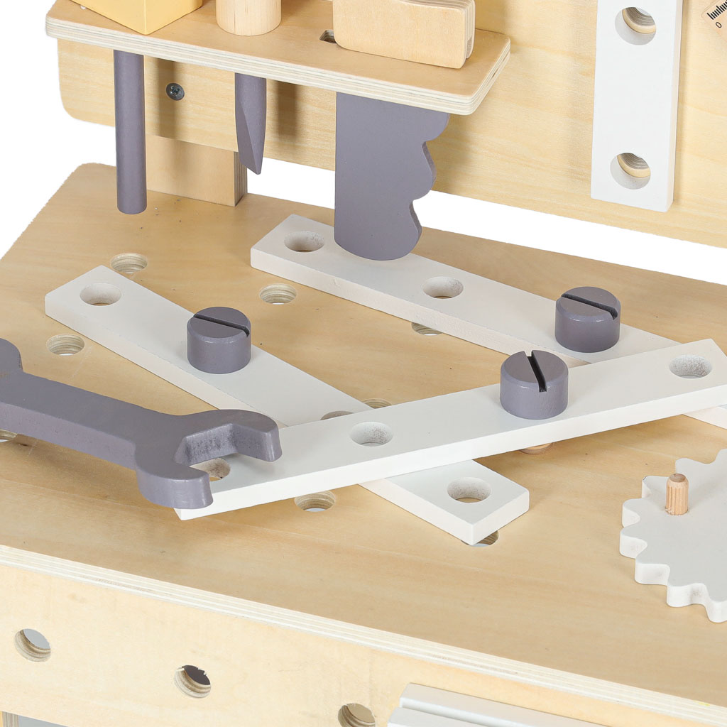 Warsztat ma wymiary 45 cm x 26 cm x 67 cm, a wysokość blatu wynosi 37 cm. Całość wykonana jest z drewna, co zapewnia trwałość i estetykę. Zestaw waży 3,64 kg, co sprawia, że jest wystarczająco stabilny do intensywnej zabawy.