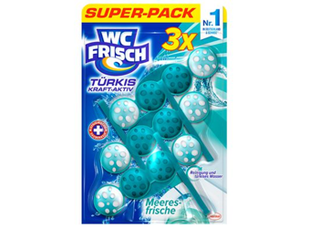 Turkusowa zawieszka WC-Frisch Kraft-Aktiv o morskiej świeżości skutecznie dba o czystość i świeżość Twojej toalety. Działa nawet między spłukaniami, co jest niezwykle praktyczne. Dzięki efektowi 4-kierunkowemu, produkt czyści toaletę przy każdym spłukiwaniu, co pomaga w redukcji osadzania się kamienia. Ponadto, zapewnia przyjemny, świeży zapach oraz higieniczną czystość.