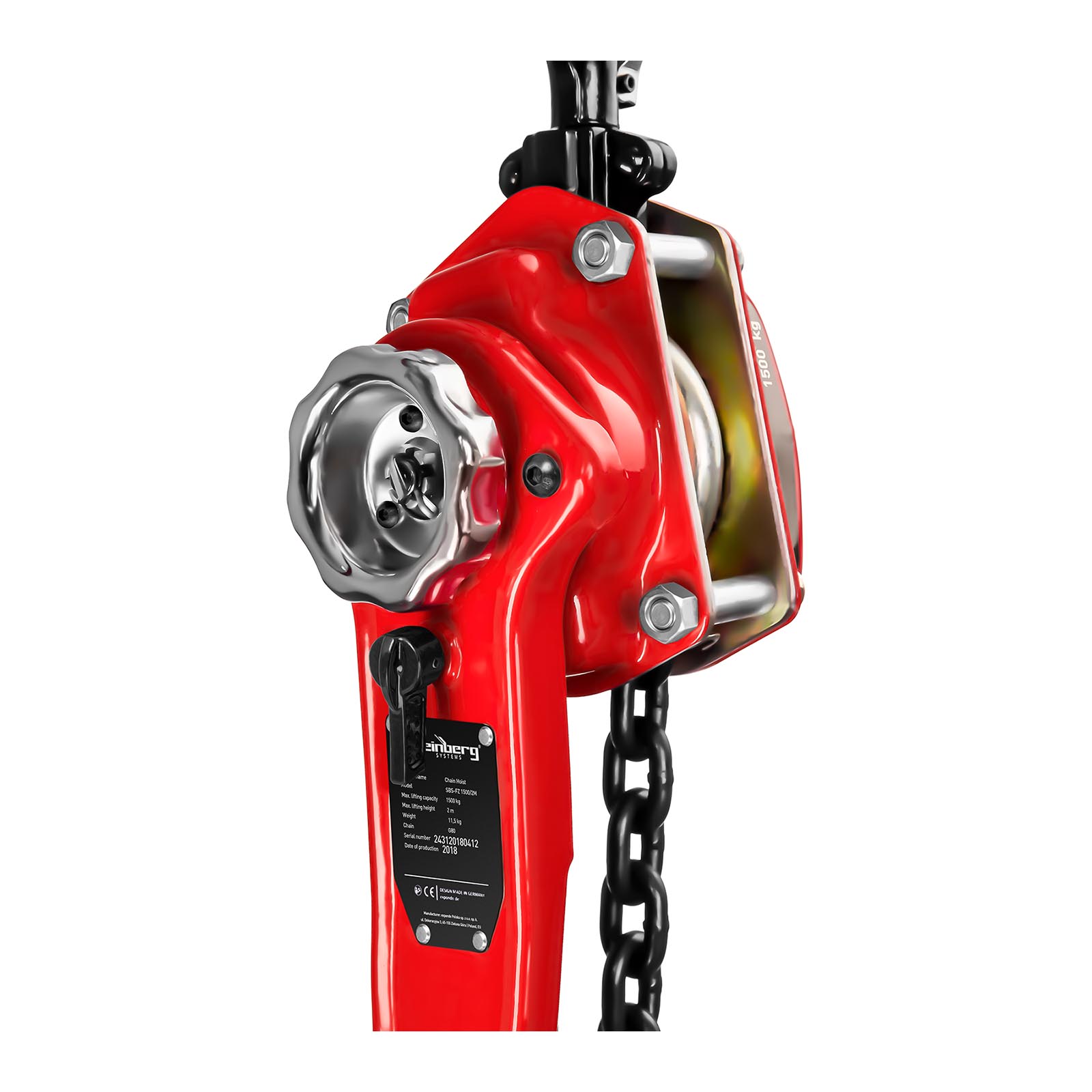 Dzięki solidnym łańcuchom (typ G80, ogniwa o średnicy 8 mm) oraz wykonaniu z wysokiej jakości stali, praca z tym modelem jest bezpieczna. Dodatkowo, gumowana końcówka drążka sterującego oraz blokada pozwalająca na zatrzymanie ładunku na żądanej wysokości zwiększają komfort użytkowania.
