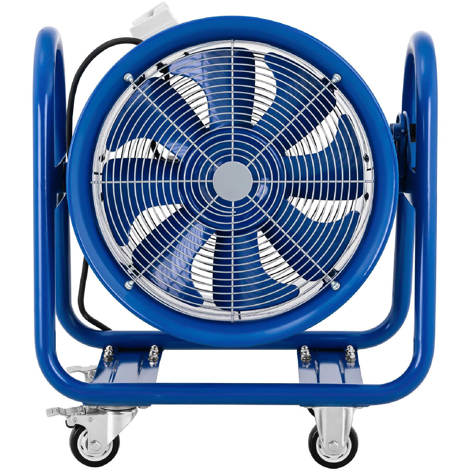 Bezpieczeństwo użytkowania zapewnia system ochrony przed przegrzaniem, który automatycznie wyłącza wentylator w razie zbyt wysokiej temperatury silnika. Solidna stalowa konstrukcja gwarantuje trwałość, a mobilność urządzenia ułatwiają 4 gumowe koła (w tym 2 skrętne z hamulcami) oraz uchwyty do przenoszenia.
