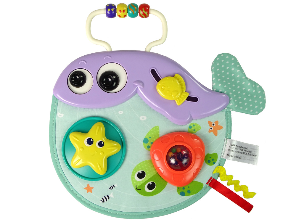 Zabawka składa się z wielu ruchomych elementów. Podczas zabawy dziecko będzie ćwiczyć koordynacje dwóch rąk, produkt umożliwia wykonanie aż 6 ćwiczeń. Wieloryb na górze posiada rączkę, co ułatwia noszenie. Żółw na skorupie ma grzechotkę, co wydaje przyjemne dźwięki. Rozgwiazda obraca się wokół własnej osi. Zabawka wykonana jest wykonana z dwóch materiałów poliestru i plastiku, całkowicie bezpieczna.