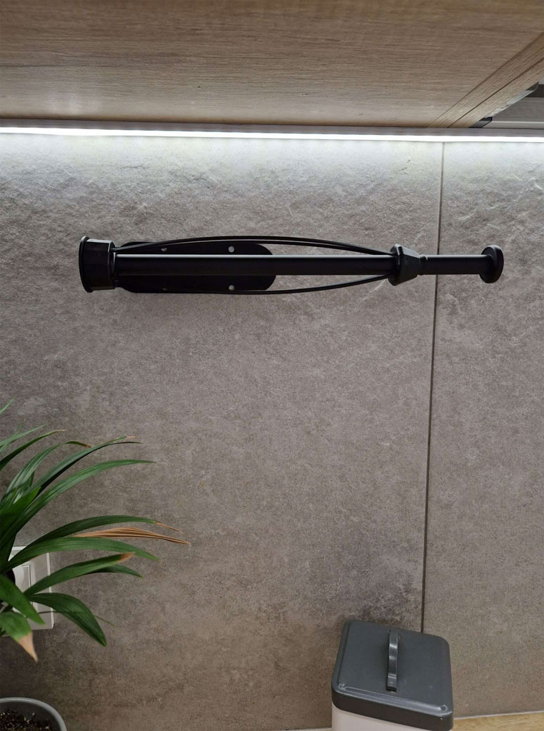 Uchwyt można zamontować zarówno w pionie, jak i w poziomie. Możesz go zamontować na ścianie lub szafce. Montaż jest prosty, a wszystkie niezbędne elementy znajdziesz w zestawie. Wieszak można przykręcić do ściany lub przykleić do szafki przy użyciu taśmy 3M.