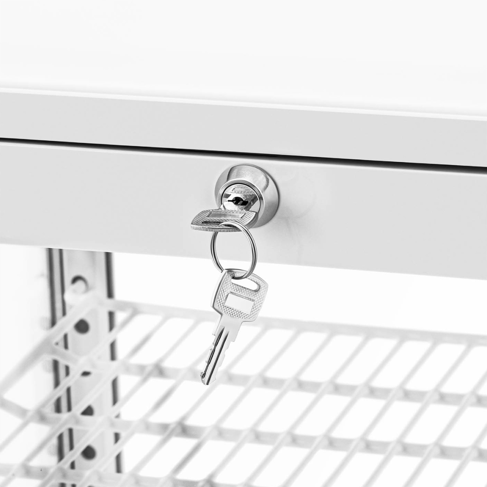 Urządzenie charakteryzuje się frontem ze szkła hartowanego oraz oświetleniem LED, co pozwala atrakcyjnie eksponować zawartość. Regulacja temperatury w zakresie 2-10°C zapewnia odpowiednie warunki przechowywania. Dodatkowo, zamykane drzwi ułatwiają uzupełnianie produktów.