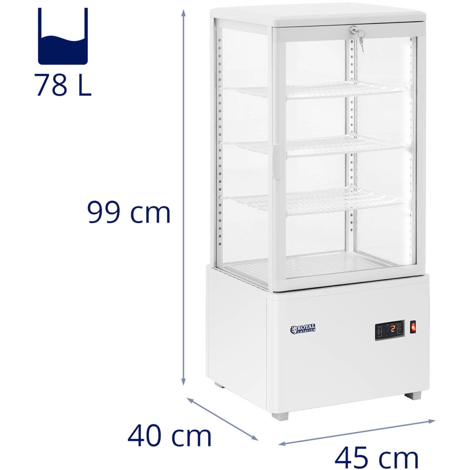Witryna chłodnicza marki Royal Catering to doskonały wybór do przechowywania i prezentacji różnorodnych produktów, takich jak desery, owoce, kanapki oraz zimne napoje. Dzięki pojemności 78 litrów oraz czterem poziomom, oferuje wystarczającą przestrzeń dla różnorodnych asortymentów, idealnie sprawdzając się w cukierniach, kawiarniach, bistro oraz hotelach.
