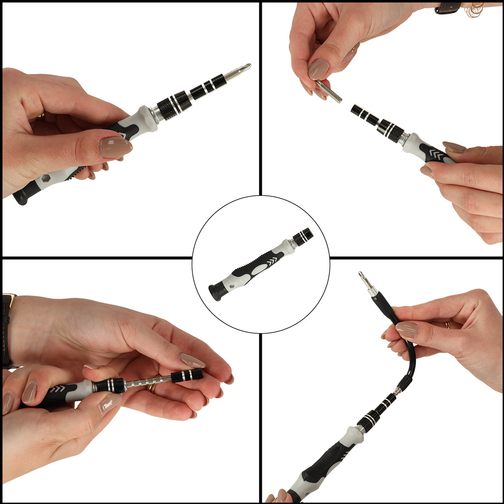 W naszym zestawie znajdziesz wkrętak z wymiennymi końcówkami, co sprawia, że jesteś gotowy na każdą sytuację. Niezależnie od tego, czy potrzebujesz rozkręcić telefon, laptop czy zegarek, ten zestaw ma wszystko, co potrzebne.