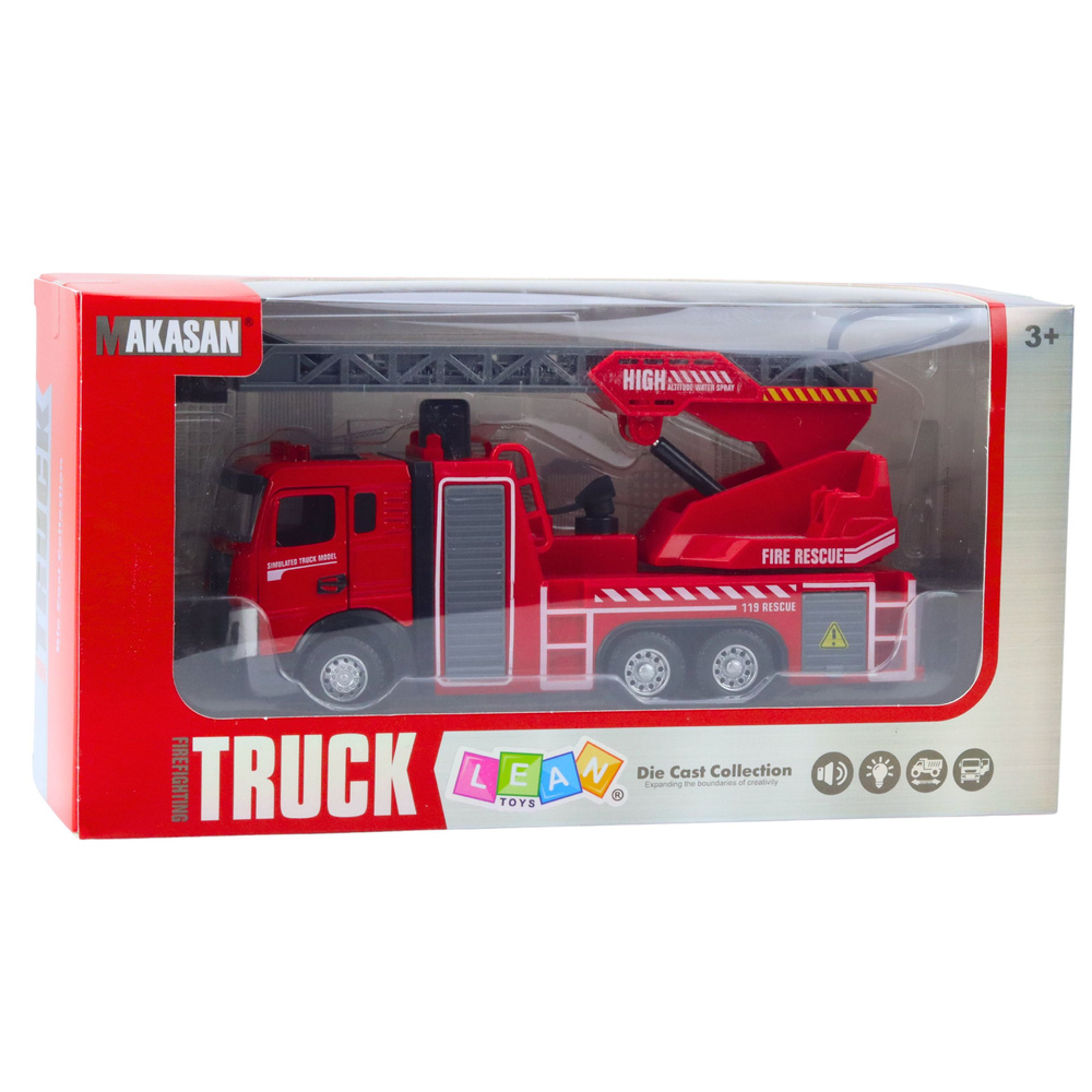 Wóz posiada funkcjonalny wysięgnik z możliwością regulacji, a dodatkowo wyposażono go w system rozpylania wody. Po wlaniu wody do specjalnego pojemnika wystarczy nacisnąć czarny przycisk, aby woda zaczęła tryskać z węża, co pozwala odtwarzać realistyczne akcje gaśnicze. Otwierane drzwi oraz metalowa kabina podnoszą autentyczność zabawki i umożliwiają dziecku wcielanie się w rolę strażaka. Model oferuje również efekty świetlne i dźwiękowe, które wzmacniają wrażenia z zabawy, rozwijając kreatywność i koordynację ruchową dziecka.