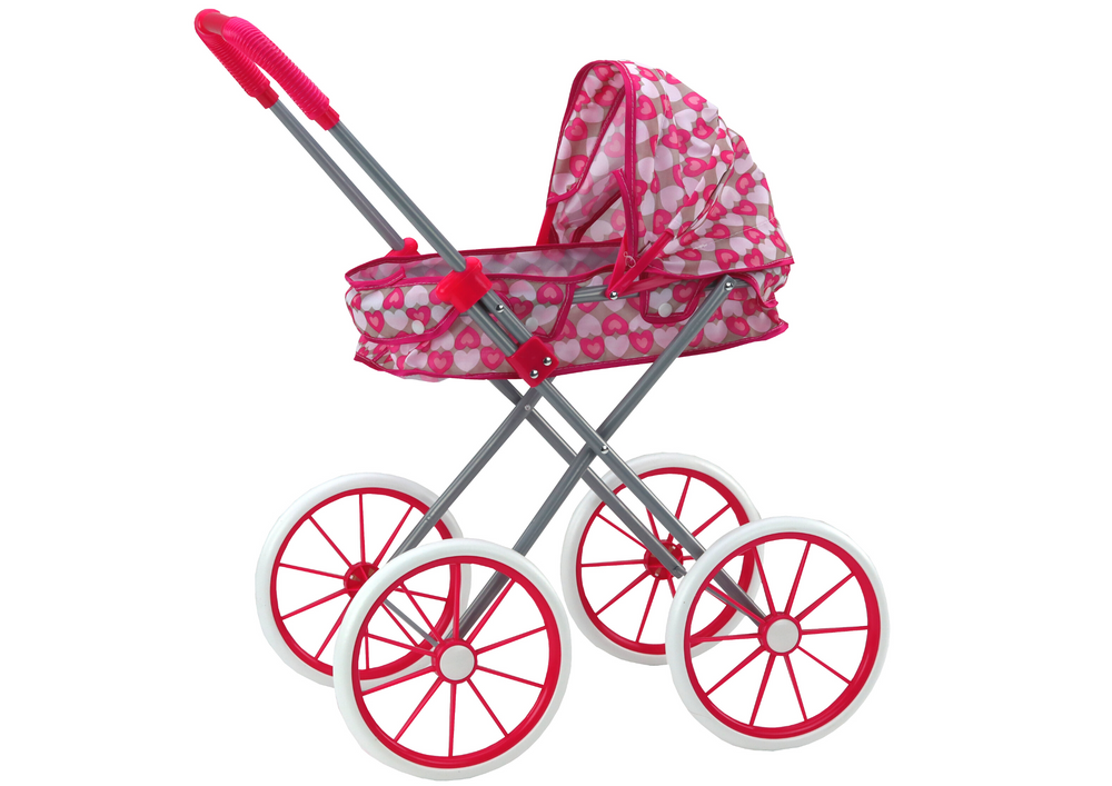 Wózek Dla Lalek Duże Koła Składany Różowy Serduszka ⭐