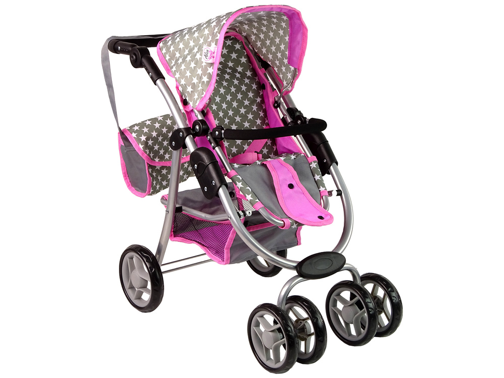 Wózek z torbą ma szary kolor z białymi gwiazdkami, daje dużo uroku. Wzornictwo przypomina prawdziwy odpowiednik, co dodaje realizmu. Konstrukcja wykonana jest z solidnych i wytrzymałych rurek aluminiowych o srebrnym kolorze, które połączone są czarnymi, plastikowymi łącznikami. Użycie do produkcji wózka wysokogatunkowego tworzywa odpowiada za komfort i wygodę płynące z użytkowania zabawki, przednie koła umożliwiają dużo lepszą możliwość prowadzenia wózka i manewrowania nim.