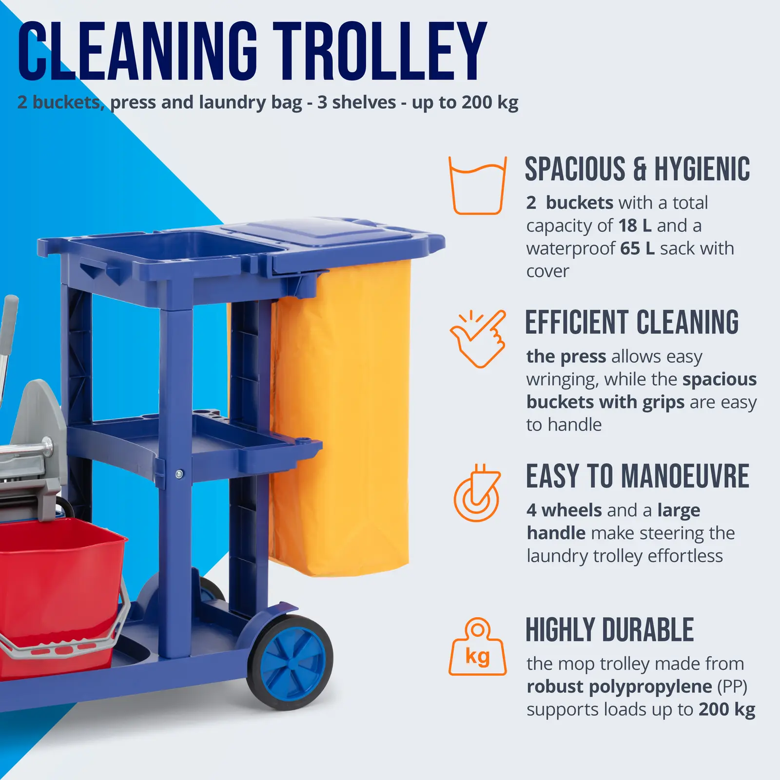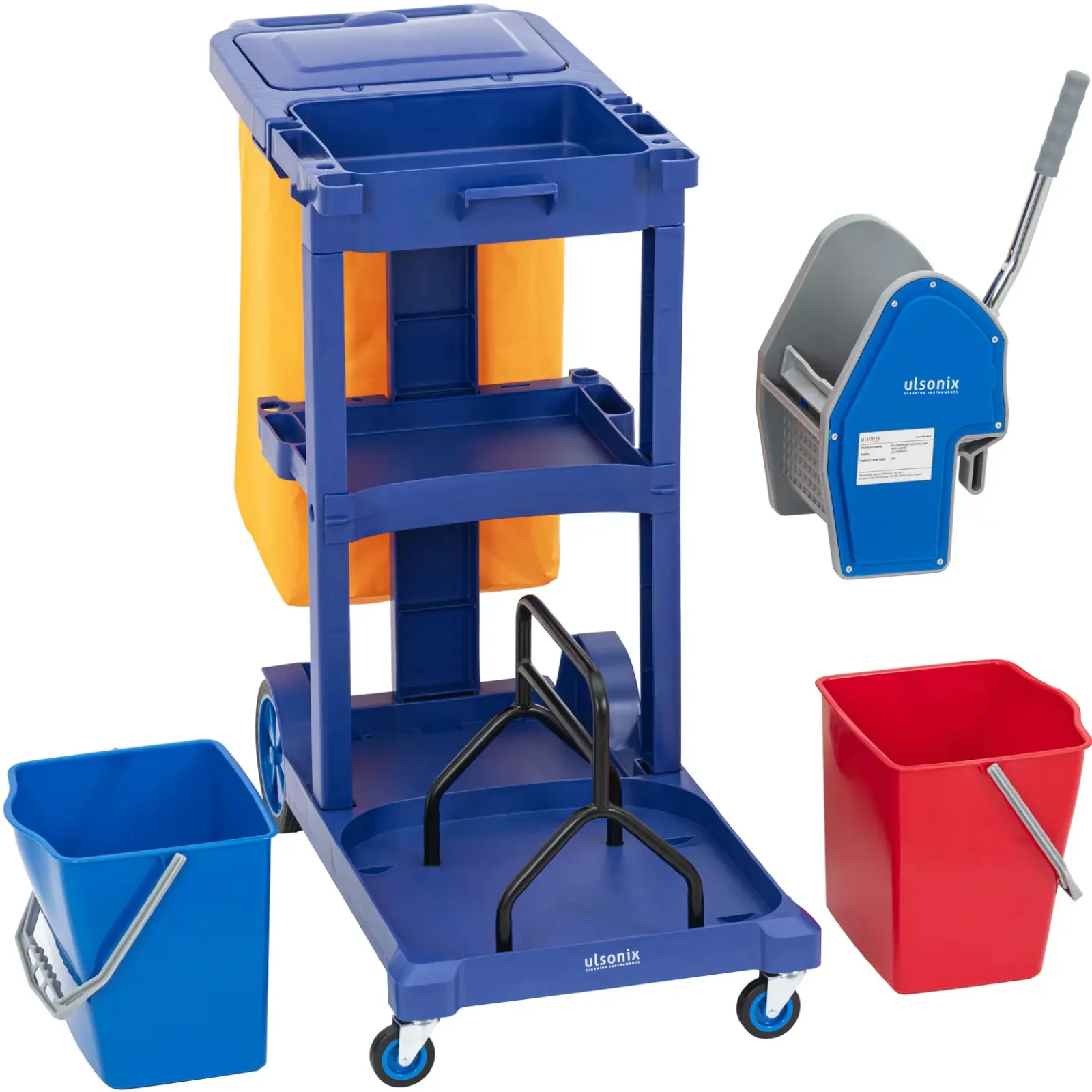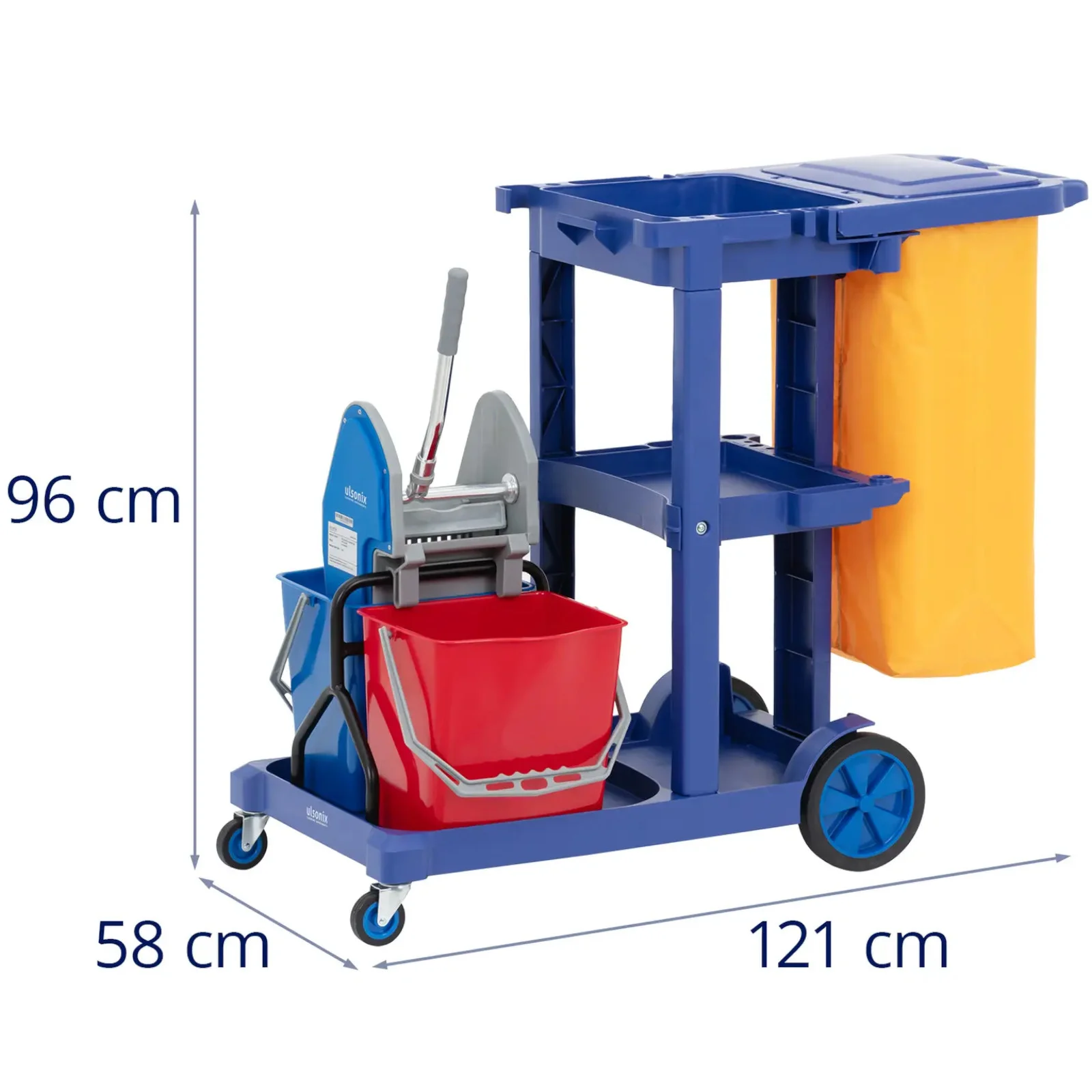 W zestawie z wózkiem znajdują się: worek (65 l), wyżymaczka, 2 wiadra (czerwone i niebieskie), uchwyt wyżymaczki, uchwyt na mopa oraz 4 koła z osłonami. Ten wielofunkcyjny wózek do sprzątania łączy w sobie wytrzymałość oraz intuicyjną obsługę, co czyni go niezawodnym partnerem w użytku profesjonalnym.