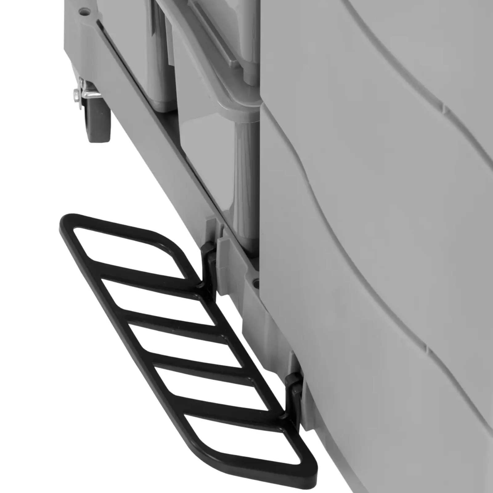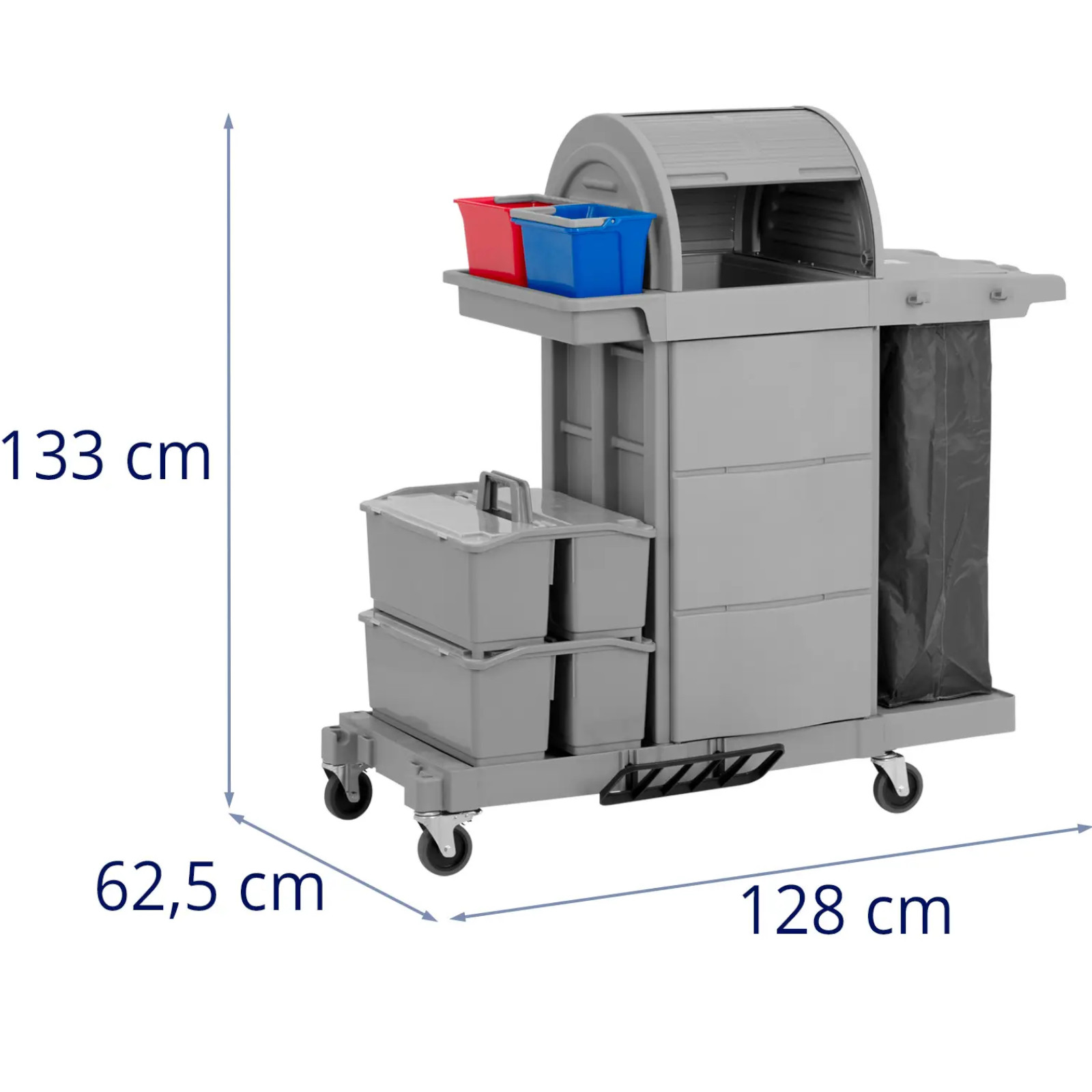 Wózek wyposażony jest w zamykany schowek, który zabezpiecza środki czystości, oraz półkę z podniesionymi krawędziami, co zapewnia ich stabilność. Górna półka jest podzielona na dwie części, co ułatwia organizację. W zestawie znajdują się 2 wiadra w różnych kolorach, a także 2 podwójne pudełka z pokrywkami oraz 3 wysuwane półki, co pozwala na schludne przechowywanie sprzętu.