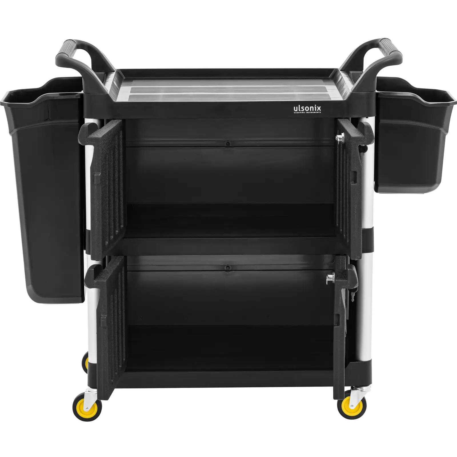 Wózek hotelowy marki Ulsonix to praktyczne narzędzie, które ułatwia sprzątanie w hotelach, szpitalach czy biurach. Dzięki trzem półkom, sprzątanie staje się bardziej zorganizowane. Górna półka zapewnia szybki dostęp do najważniejszych akcesoriów, takich jak szczotki czy ściereczki.