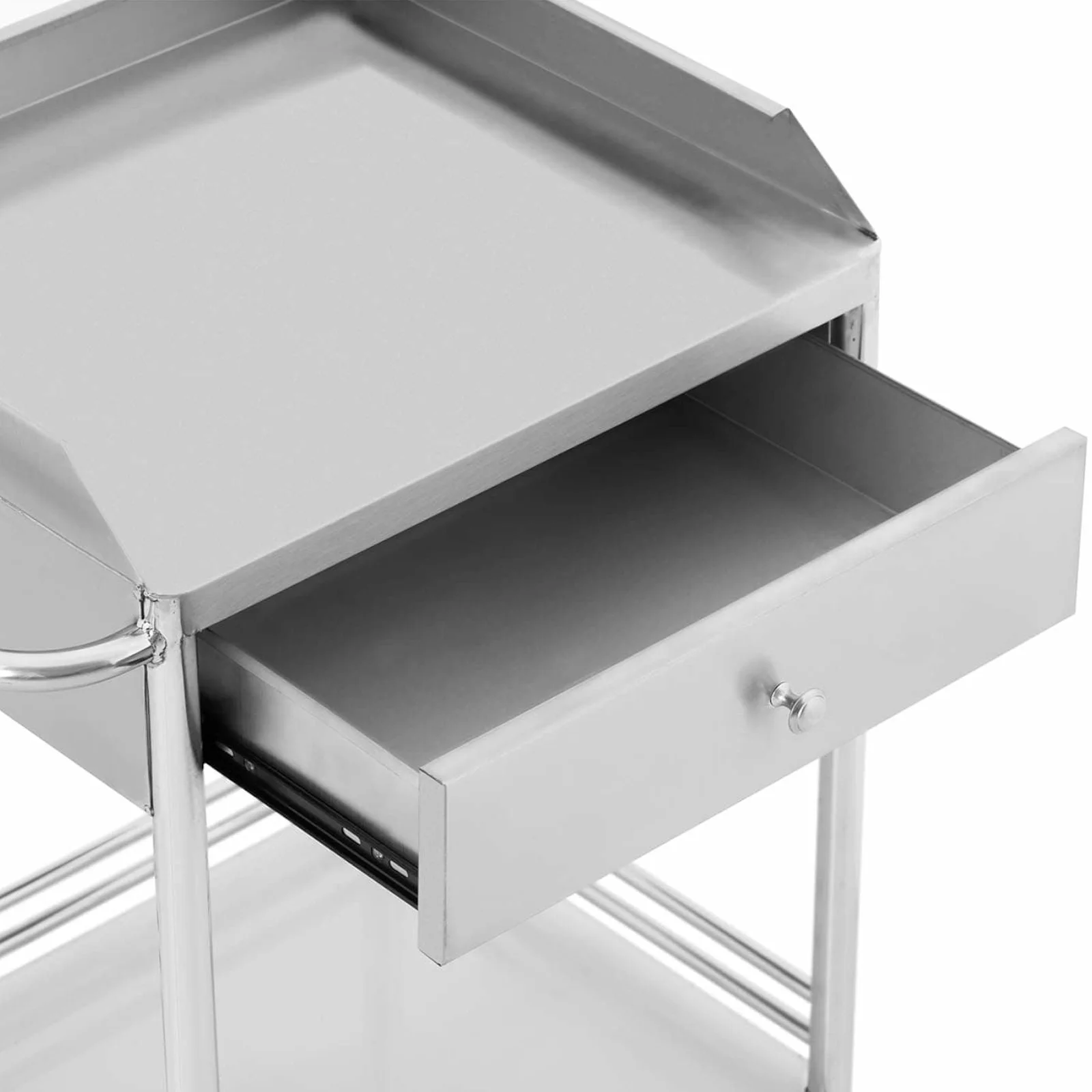 Wózek jest mobilny dzięki czterem kółkom, a dodatkowe dwa hamulce zapewniają stabilność w trakcie pracy. Wykonany ze stali nierdzewnej, gwarantuje trwałość i łatwość w utrzymaniu czystości.