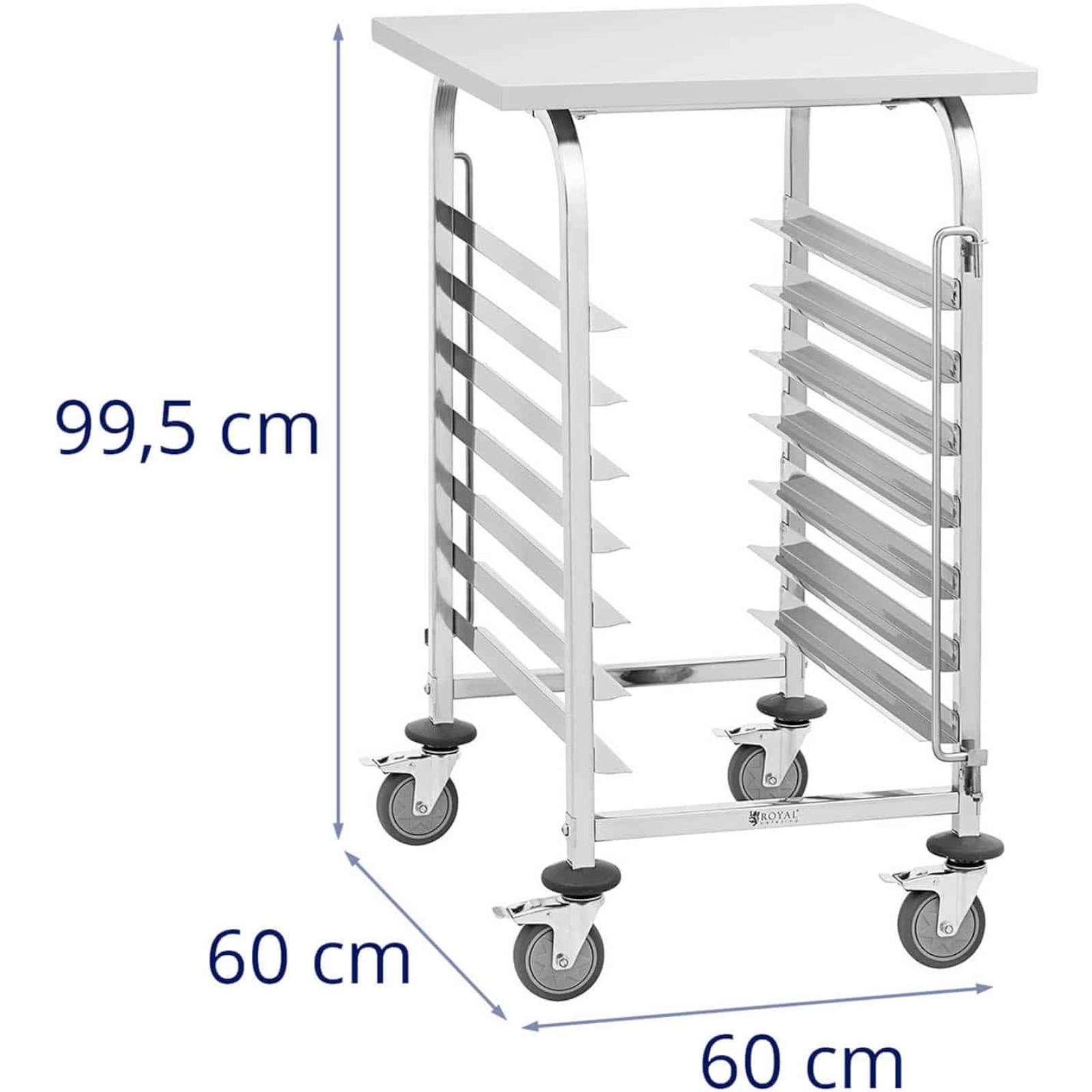 Wózek transportowy marki Royal Catering to funkcjonalne rozwiązanie dla piekarni, cukierni i sklepów z czekoladą. Dzięki możliwości transportu aż 7 tac oraz dodatkowej półce, zyskujesz wygodę i efektywność w codziennej pracy. Nośność wózka wynosi 10 kg na poziom, a dodatkowa półka uniesie również 10 kg, co razem daje aż 80 kg. Odstęp między poziomami to 8 cm, co pozwala na wygodne umieszczanie i wyjmowanie tac.