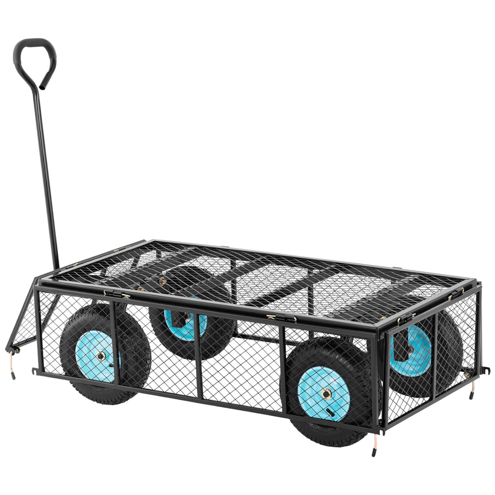 Wózek charakteryzuje się składanym designem, co pozwala na oszczędność miejsca podczas przechowywania. Stalowa rama zapewnia stabilność, a duże gumowe koła o średnicy 25 cm sprawdzają się w różnych warunkach terenowych. Dodatkowo, wygodny wyściełany uchwyt ułatwia manewrowanie, co podnosi komfort użytkowania.