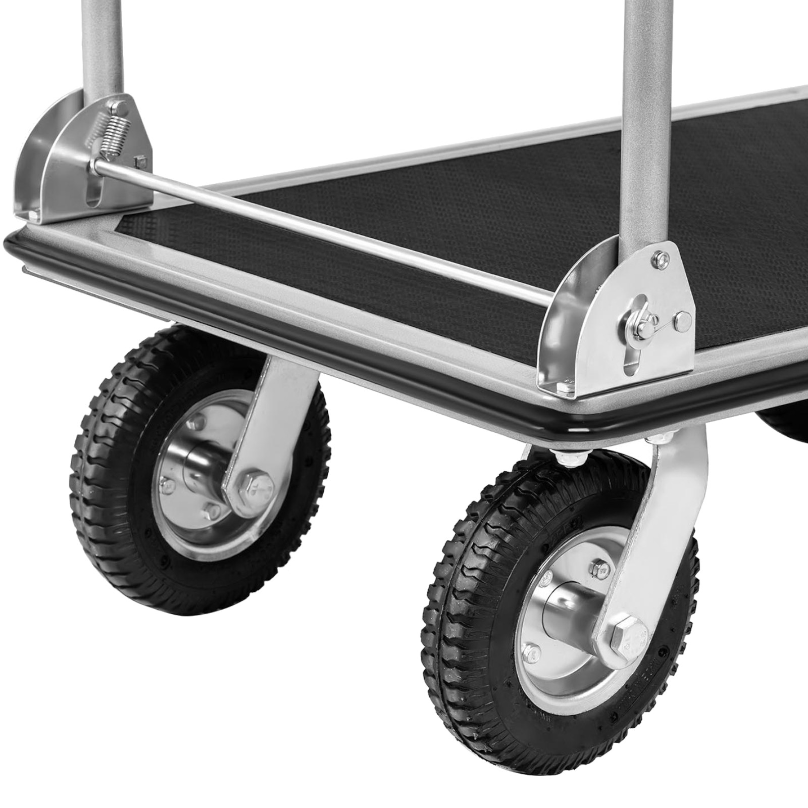 Otwarta platforma o wymiarach 80 x 60 cm jest wyposażona w antypoślizgową matę, co zapewnia bezpieczeństwo podczas transportu. Jedna burta skutecznie zabezpiecza przewożone przedmioty. Wózek charakteryzuje się składanym uchwytem, co ułatwia jego przechowywanie.