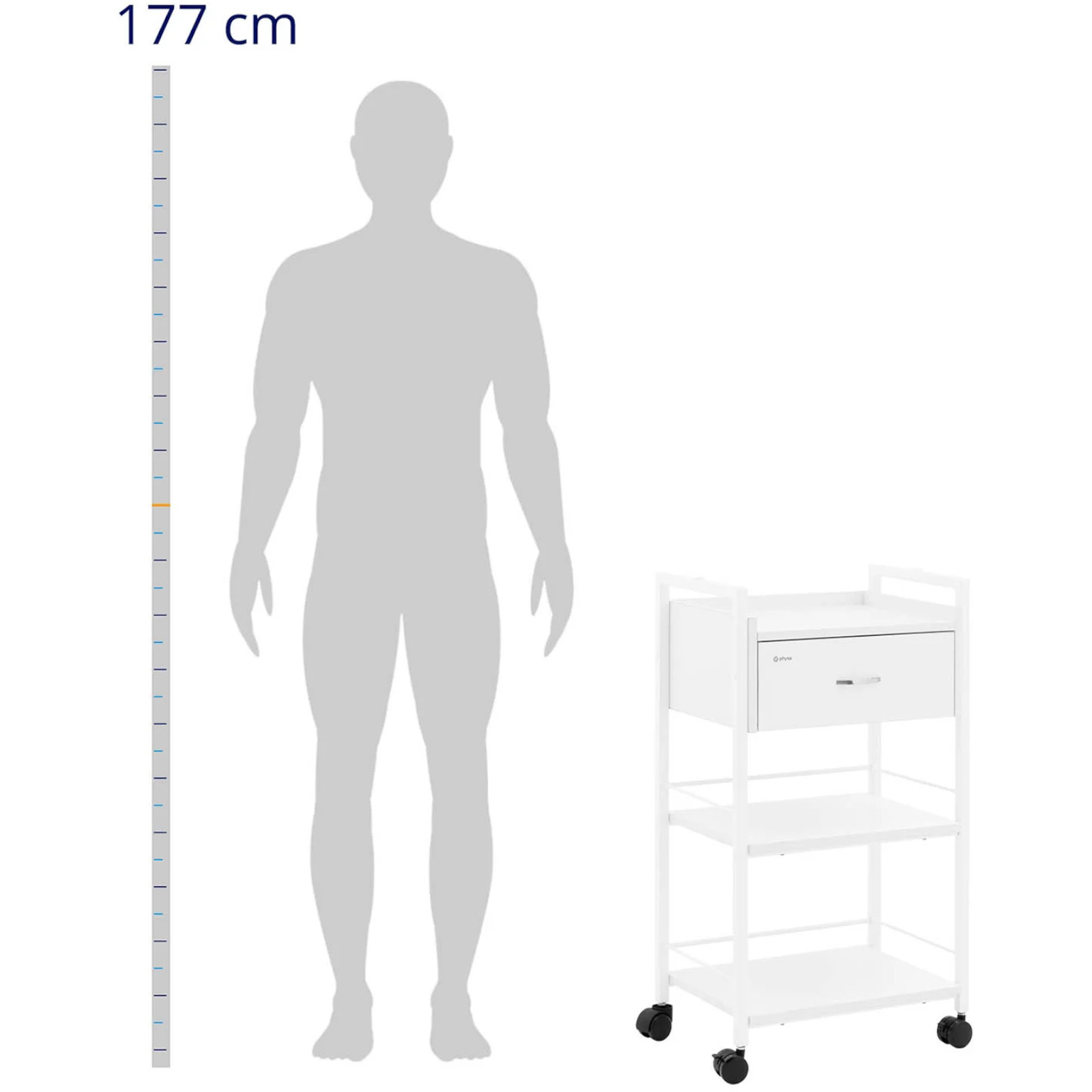 Korzyści: - Mobilność dzięki 4 płynnie działającym kółkom - Duża pojemność z 3 półkami i zamykaną szufladą - Lekka konstrukcja ułatwiająca przemieszczanie - Łatwe czyszczenie dzięki gładkim powierzchniom - Solidna stalowa rama zapewniająca trwałość