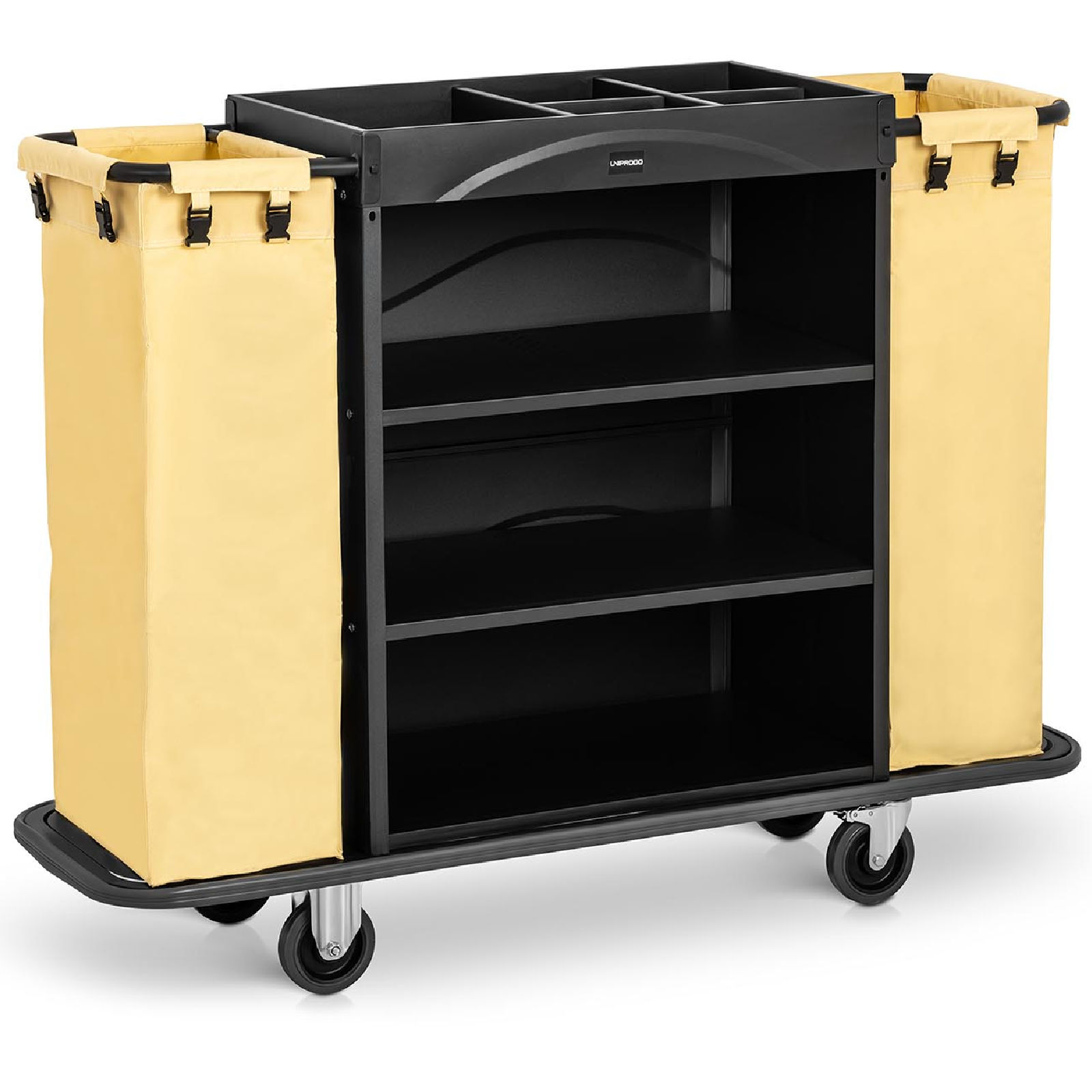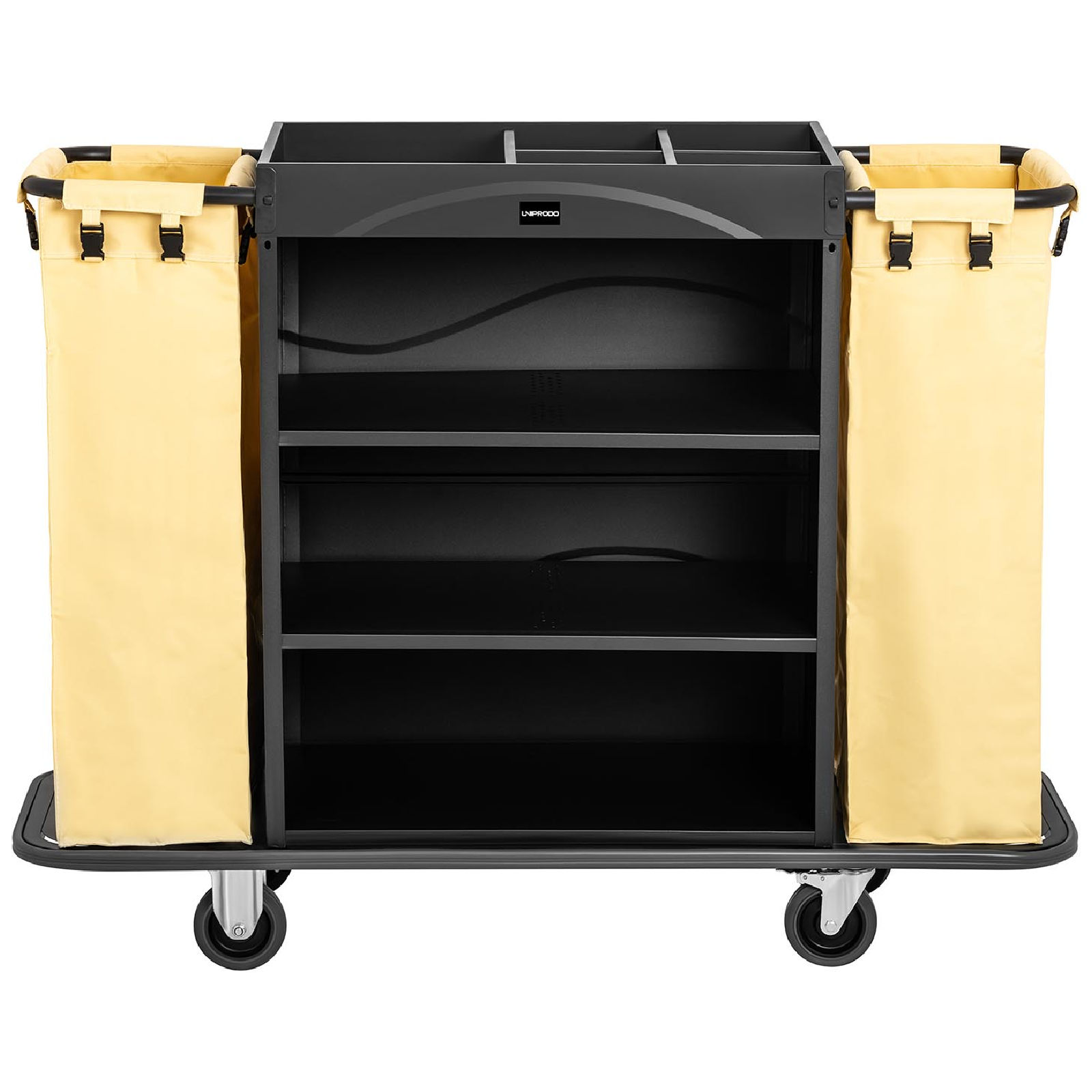 Wózek hotelowy marki Uniprodo to doskonałe rozwiązanie do ułatwienia codziennych prac porządkowych. Dzięki trzem dużym półkom, idealnie sprawdzi się w przewożeniu czystej pościeli oraz środków czystości. Oferuje wysoką ładowność do 150 kg, co czyni go bardzo funkcjonalnym sprzętem.