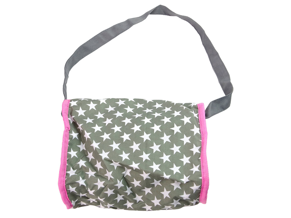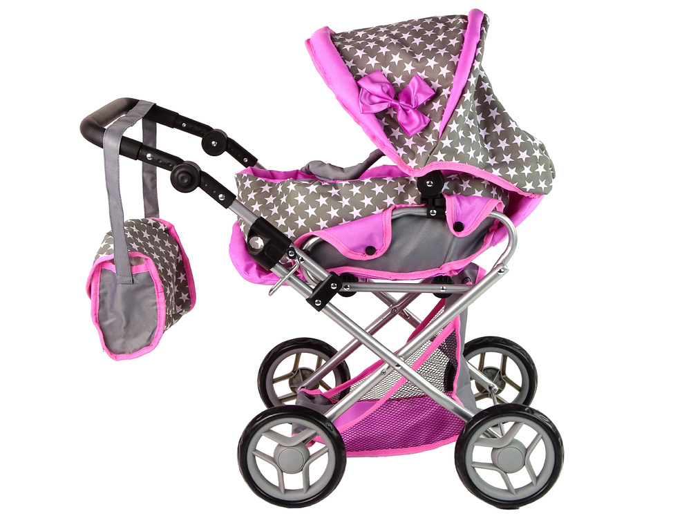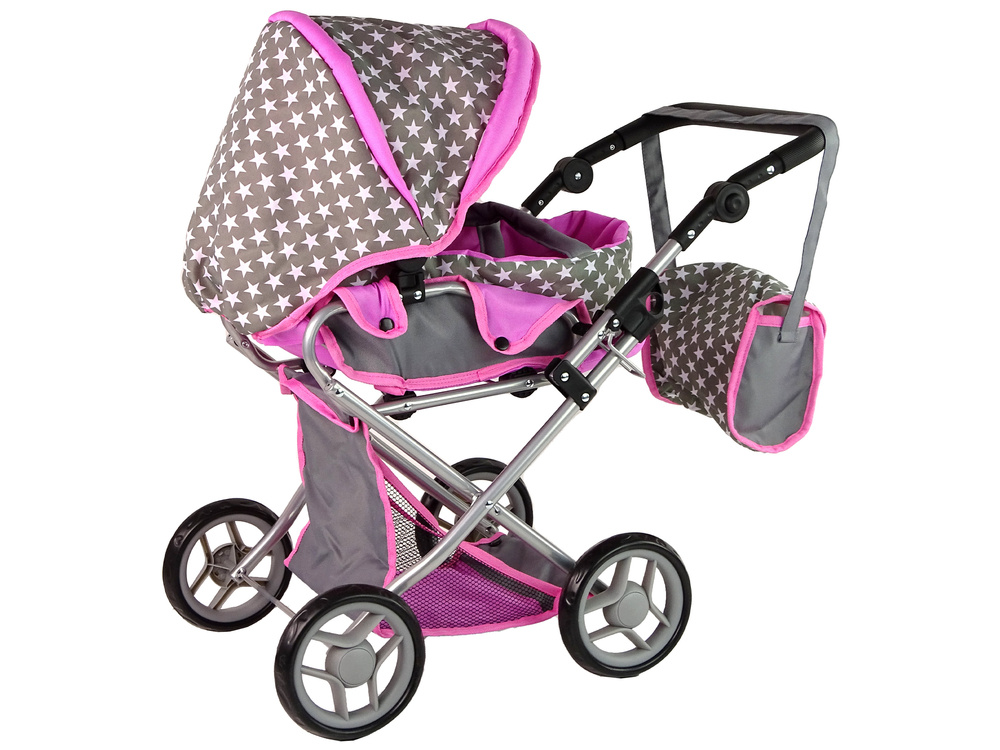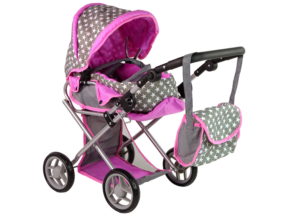 Wózek z torbą ma szary kolor z białymi gwiazdkami, daje dużo uroku. Wzornictwo przypomina prawdziwy odpowiednik, co dodaje realizmu. Konstrukcja wykonana jest z solidnych i wytrzymałych rurek aluminiowych o srebrnym kolorze, które połączone są czarnymi, plastikowymi łącznikami. Użycie do produkcji wózka wysokogatunkowego tworzywa odpowiada za komfort i wygodę płynące z użytkowania zabawki, co w połączeniu z ulokowaniem wózka na czterech wąskich kołach podnosi łatwość prowadzenia wózka i manewrowania nim.
