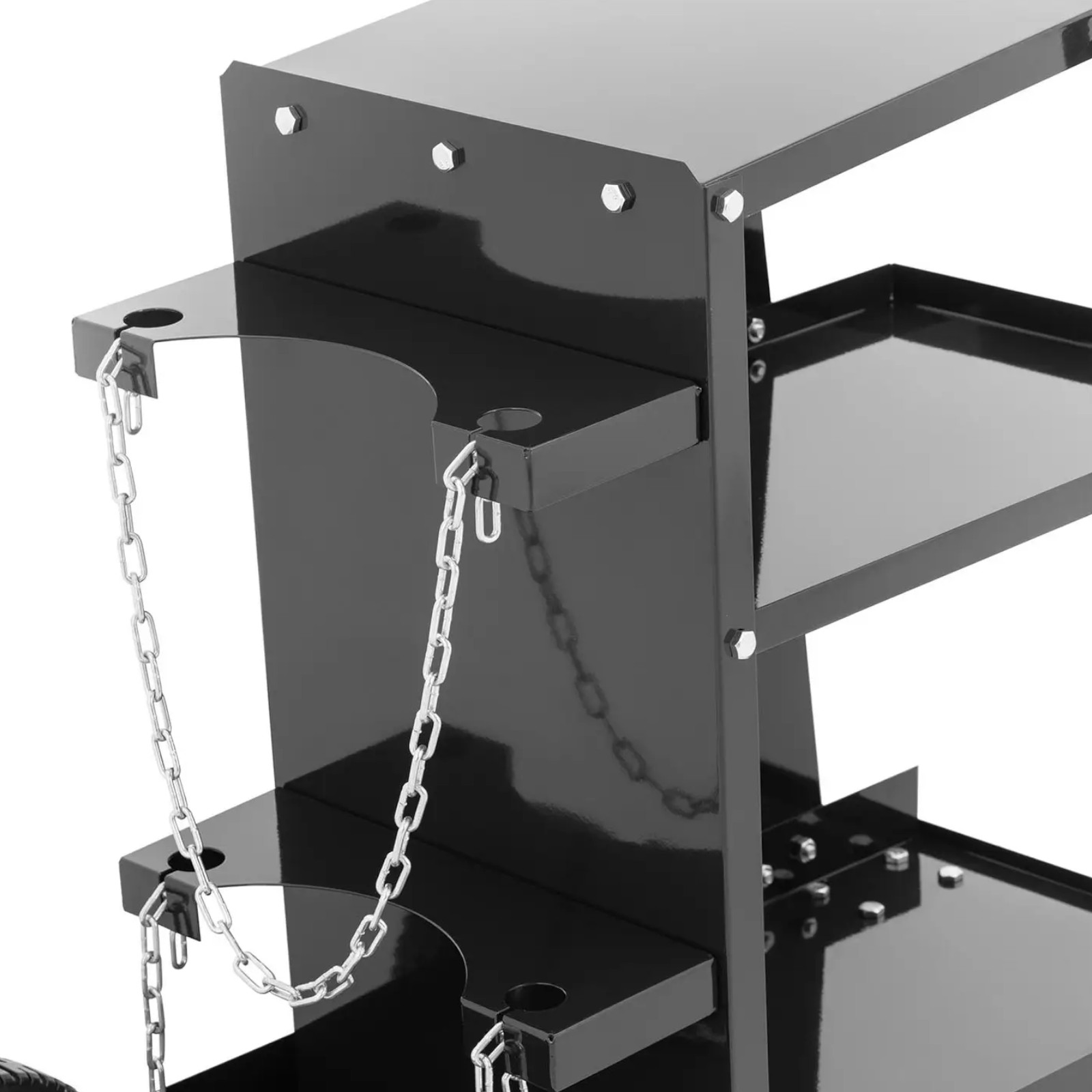Wózek spawalniczy warsztatowy to praktyczne rozwiązanie do transportu butli gazowych oraz akcesoriów spawalniczych. Dzięki trzem poziomom przechowywania, oferuje on dużą przestrzeń na niezbędne narzędzia. Górna półka ma wymiary 33,3 x 53,2 cm, co umożliwia umieszczenie większych przedmiotów. Środkowa półka o wymiarach 33,5 x 51,5 cm jest idealna do przechowywania drobnych akcesoriów.