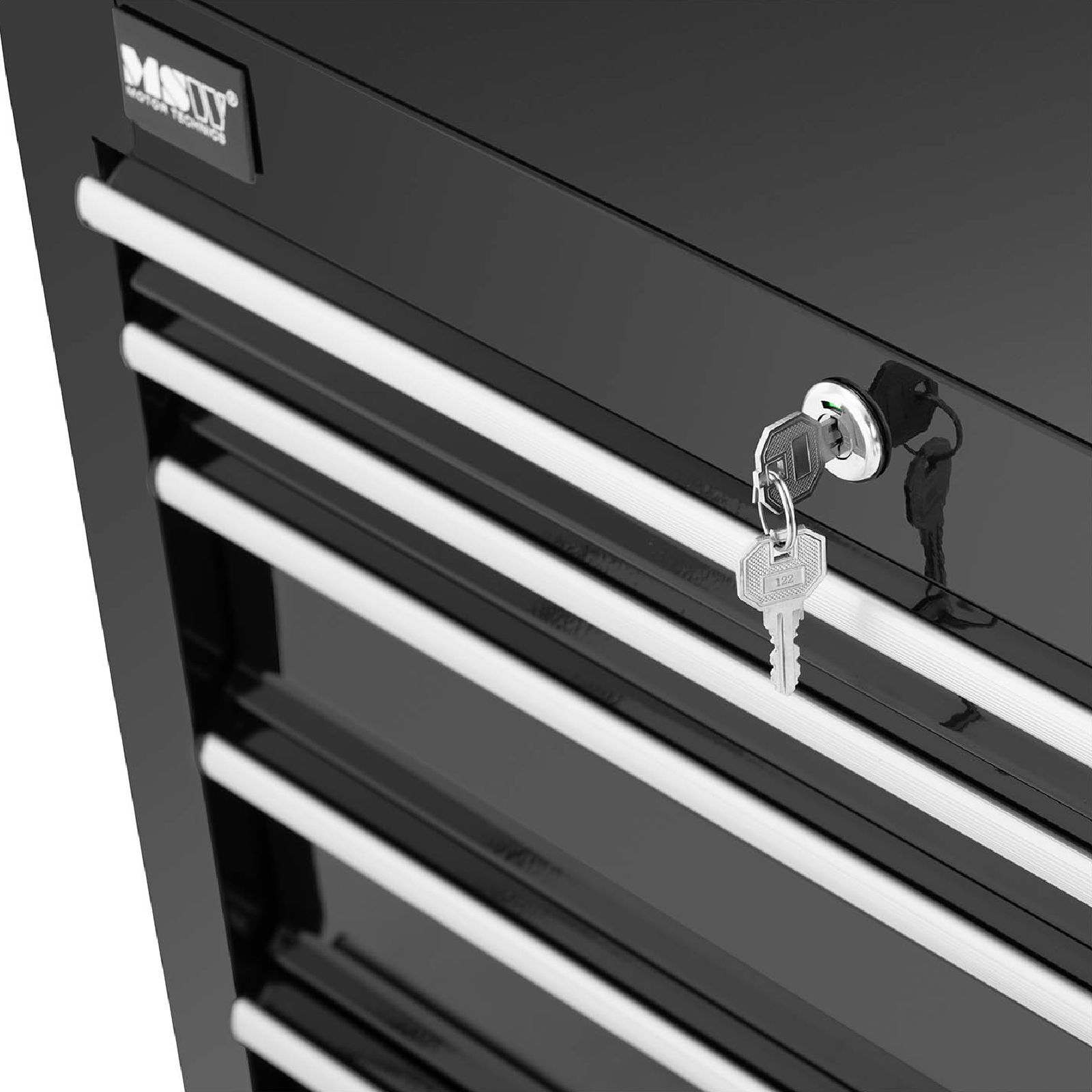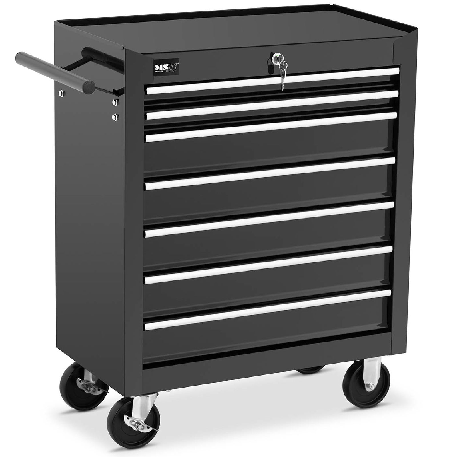 Wózek wyposażony jest w 7 pojemnych szuflad o różnych wymiarach: pierwsze dwie szuflady mają wymiary 51 x 29 x 4 cm, a pozostałe pięć 51 x 29 x 8,5 cm. Górna półka o wymiarach 61 x 32,5 cm ma nośność do 25 kg, co zapewnia dodatkową przestrzeń roboczą. W zestawie znajdują się również maty antypoślizgowe, co zwiększa komfort użytkowania.