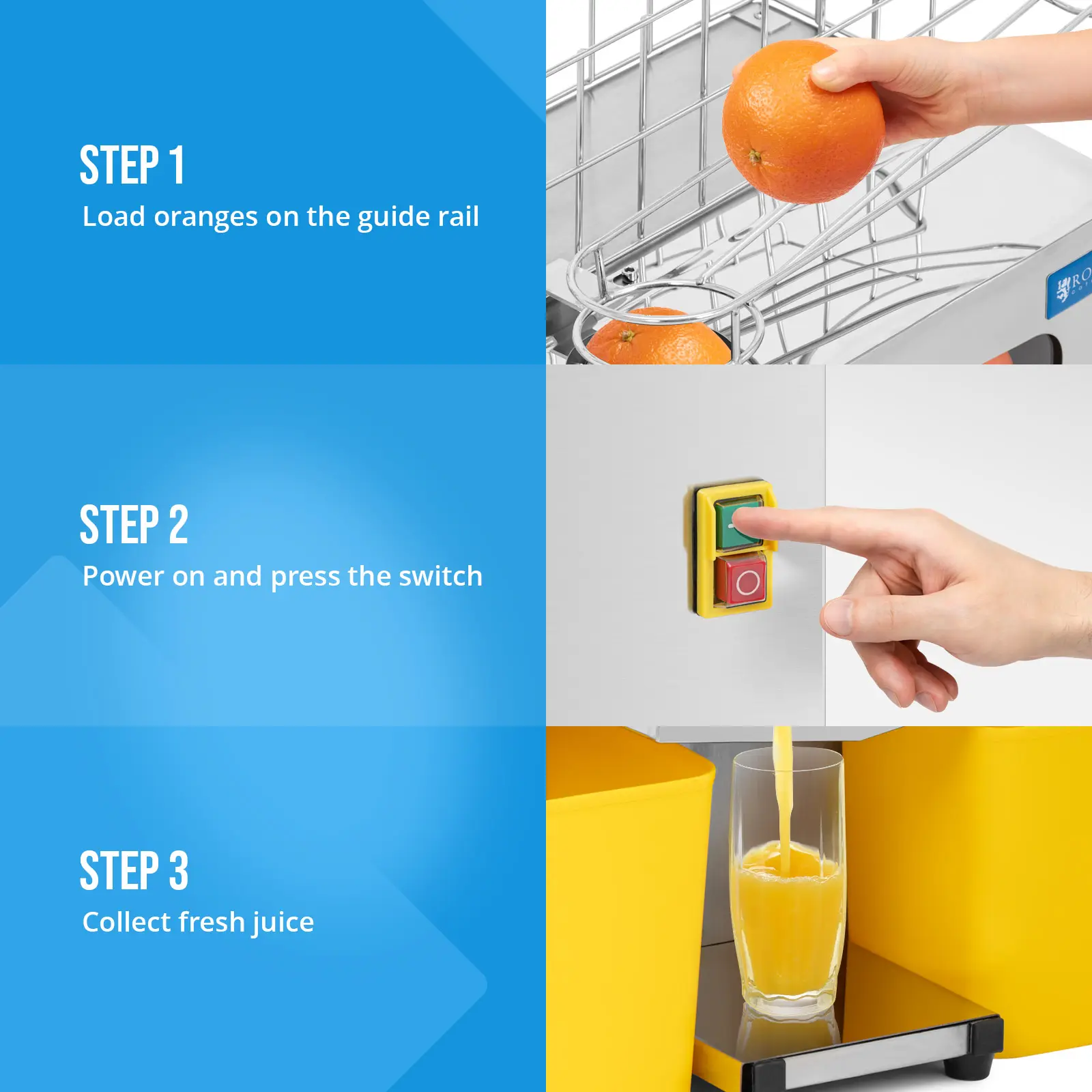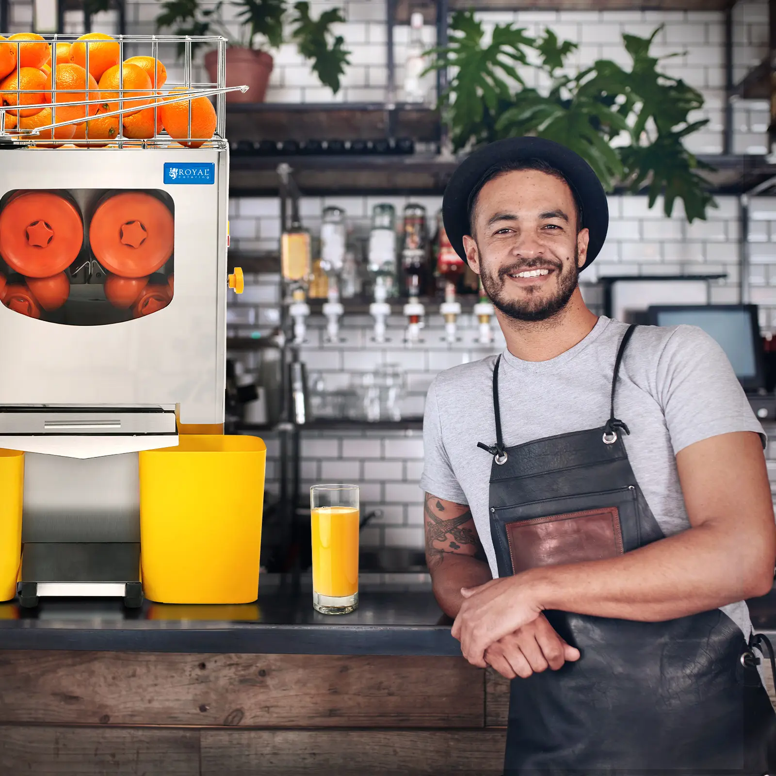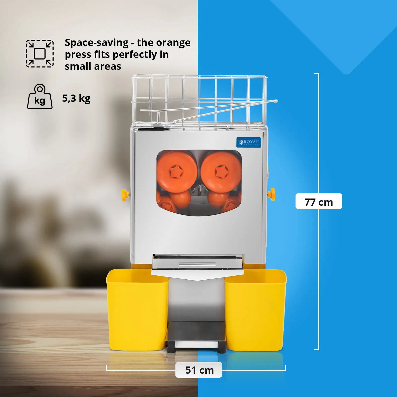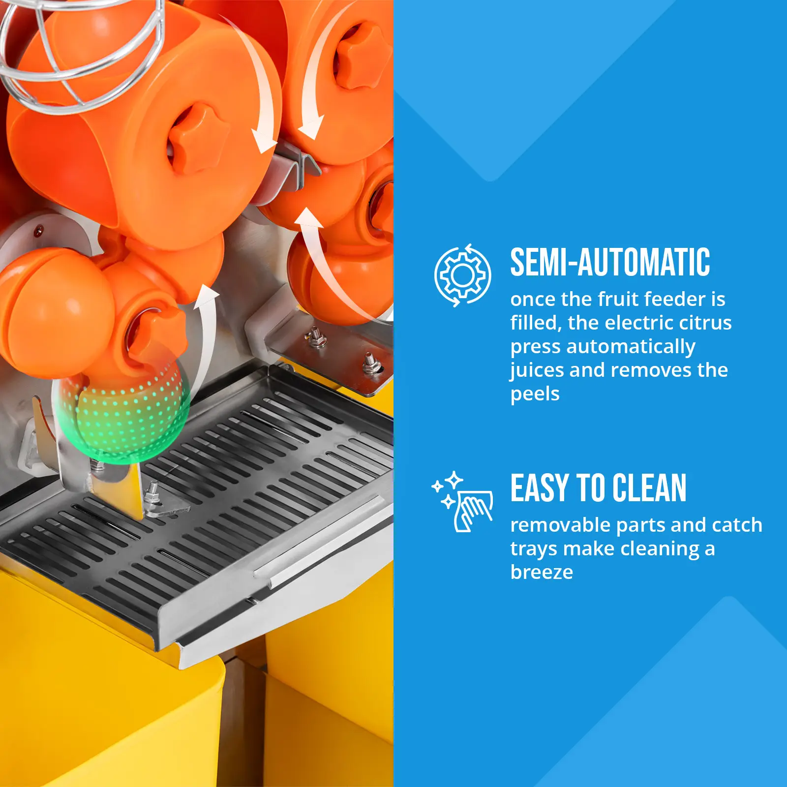 Dzięki imponującej wydajności, urządzenie potrafi przetworzyć aż 20 owoców na minutę, co znacząco zwiększa efektywność pracy w każdej gastronomii. Wystarczy napełnić wlot owocami, a resztki zostaną automatycznie odprowadzone do pojemników zbiorczych, co oszczędza czas i pozwala na łatwe sprzątanie.