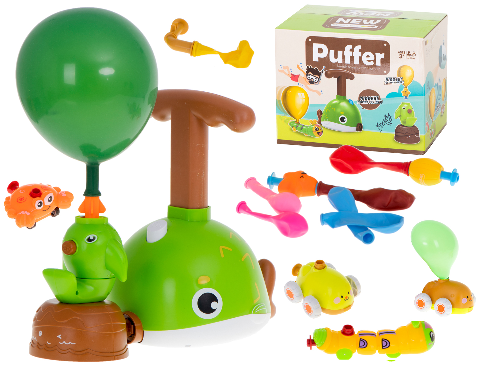 W skład zestawu wchodzi m.in. wyrzutnia, dwa samochodziki, 12 balonów, rozgwiazda, piłka, latający gwizdek oraz gąsienica. Tak różnorodne elementy zapewniają mnóstwo kreatywnej zabawy.