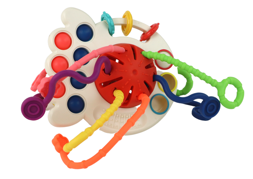 ✅ Zabawka rozwojowa: Sensoryczna zabawka edukacyjna, która angażuje dziecko poprzez ciągnięcie kolorowych nici, wyciskanie bąbelków oraz przesuwanie ich. Stymuluje umiejętności motoryczne i rozwój dotykowy.