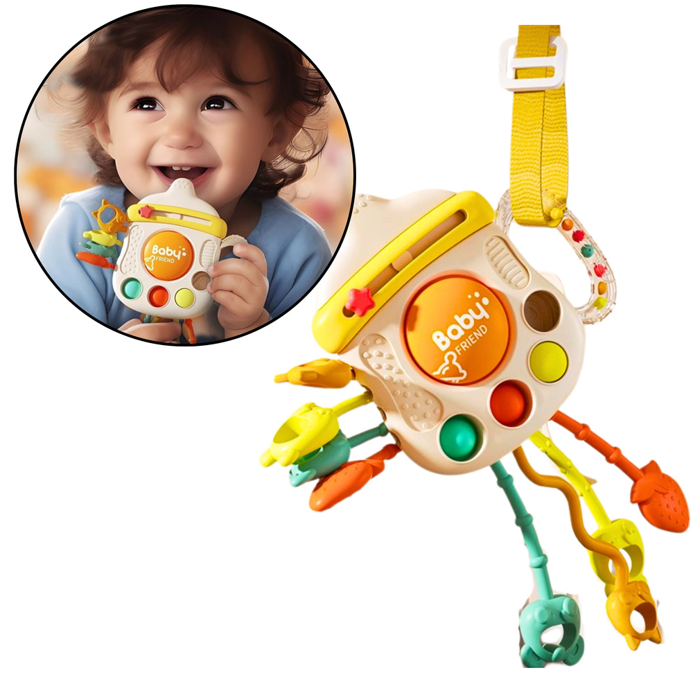 Zabawka posiada liczne kolorowe sznurki i elementy do ciągnięcia oraz przesuwania, które zachęcają malucha do aktywności i eksplorowania. Kształtem przypomina butelkę do karmienia, co czyni ją atrakcyjną i bliską dziecku. Dzięki specjalnemu paskowi, zabawkę można przypiąć do wózka, fotelika lub łóżeczka, aby towarzyszyła dziecku w każdej chwili. Zróżnicowane tekstury i kolory przyciągają uwagę malucha.