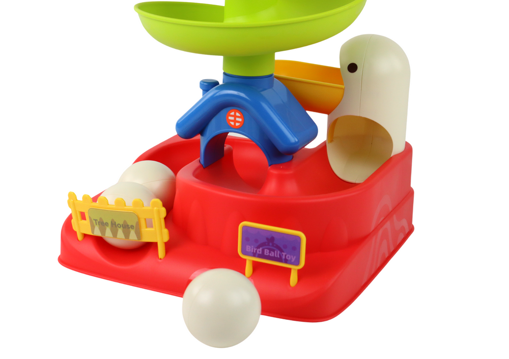 Głównym elementem zabawki jest kolorowa zjeżdżalnia, która przyciąga uwagę dziecka dzięki jaskrawym barwom i wysokości prawie 36 cm. Na górze zjeżdżalni umieszczony jest uroczy kurczaczek, który pełni funkcję interaktywnego elementu. Kurczaczek wydaje różne dźwięki, co stanowi dodatkową stymulację dla zmysłów dziecka, pobudzając jego ciekawość i rozwijając zdolności poznawcze.