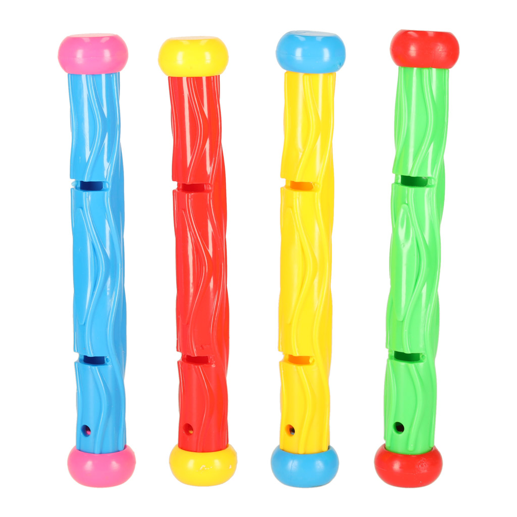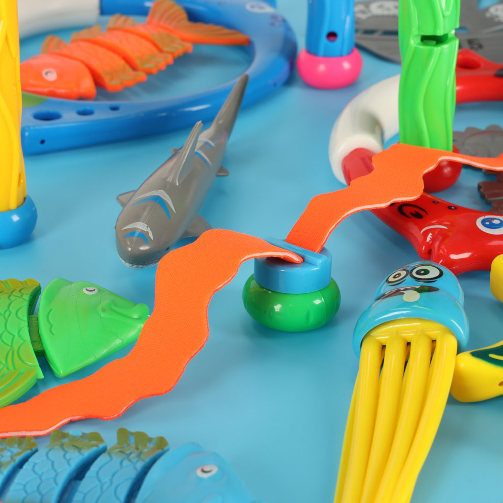 W zestawie znajdują się elementy, które pomagają w rozwijaniu zręczności i motoryki, takie jak rurki do nurkowania, które umożliwiają wyławianie zabawek z wody.