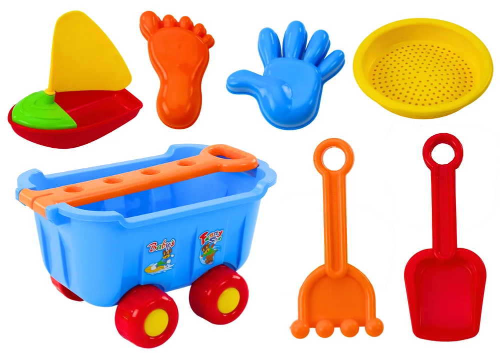 Zestaw zabawek do piasku z niebieskim wózkiem na kółkach to wszechstronny i przemyślany komplet, który dostarczy dzieciom niekończącej się radości podczas zabawy w piasku.
