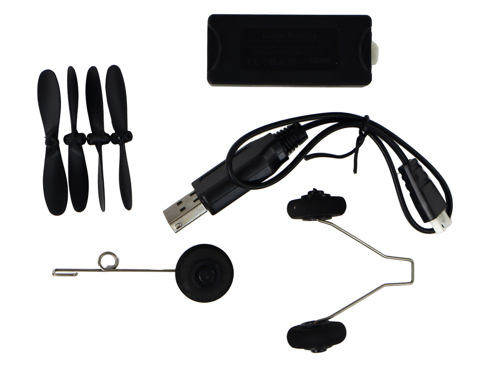 W zestawie dołączone są również cztery wymienne śmigła oraz kabel do ładowania akumulatora.
