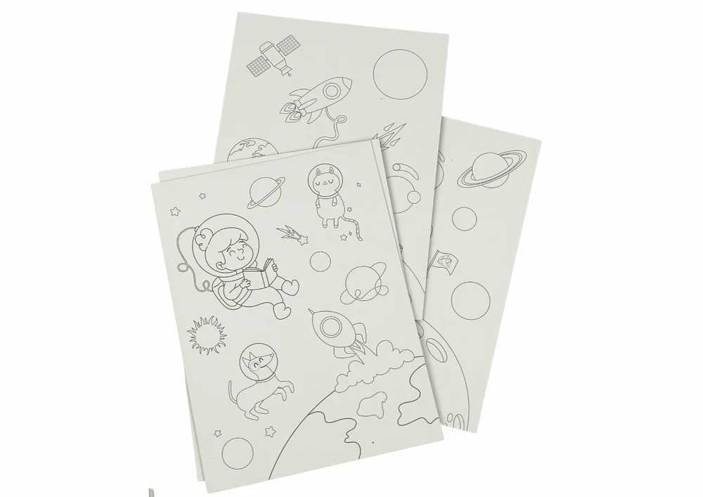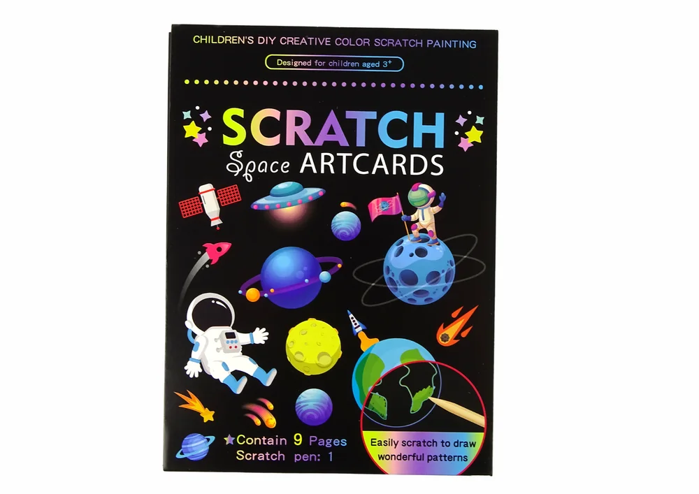 W zestawie znajdziesz 9 obrazków do zdrapywania, które ożywiają się przed oczami dziecka. Zabawa jest prosta: używając specjalnego drewnianego patyczka, można zdrapywać czarną warstwę na obrazku, odkrywając piękne i kolorowe ilustracje. Te ilustracje przedstawiają różne sceny z kosmosu.