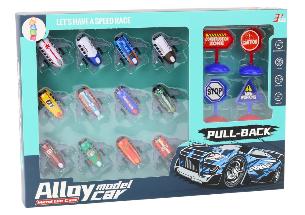 Zestaw 12 Autek Samolotów z napędem 5cm znaki drogowe