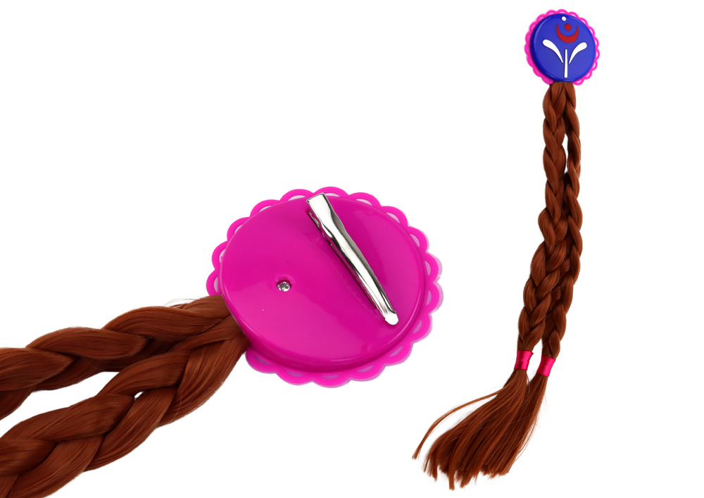 Na początek mamy piękną spinkę z dwoma długimi warkoczami, które dodadzą uroku i elegancji każdej fryzurze. Różową rękawiczkę zdobioną niebieskim brokatem, która dodaje niezwykłego blasku i sprawi, że Twoja mała księżniczka będzie błyszczeć na każdym balu.
