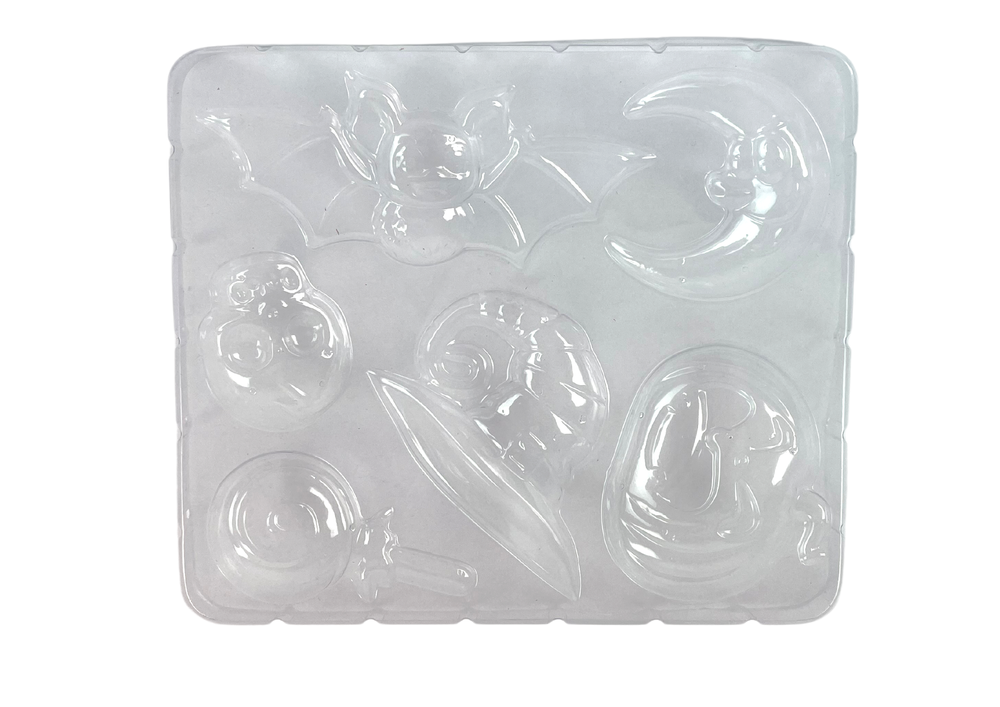 - foremka z formami w kształcie czaszki, dyni, księżyca, nietoperza, cukierkowego lizaka i dużego kapelusza