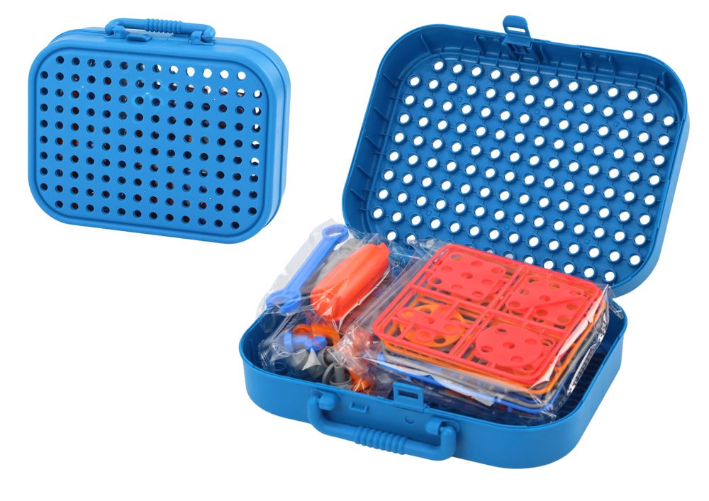Po otwarciu walizki odkrywasz możliwość jej rozkładania, tworząc solidny stolik, na którym można swobodnie zabawić się w konstruowanie. Zestaw jest wyposażony w klucz płasko-oczkowy, śrubokręt oraz szeroki wybór śrubek i nakrętek, co umożliwia łatwe montowanie i demontowanie elementów, rozwijając jednocześnie zdolności manualne i logiczne myślenie.