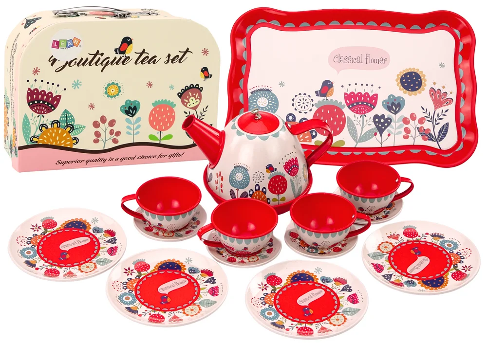 Przedstawiamy zestaw do kawy i herbaty w kuferku, idealny do rozwijania wyobraźni i zabawy w odgrywanie ról. Kuferek z trwałego materiału jest łatwy do przenoszenia. Zestaw zawiera talerzyki, czajnik, filiżanki i tackę w czerwonej kolorystyce z ciekawymi