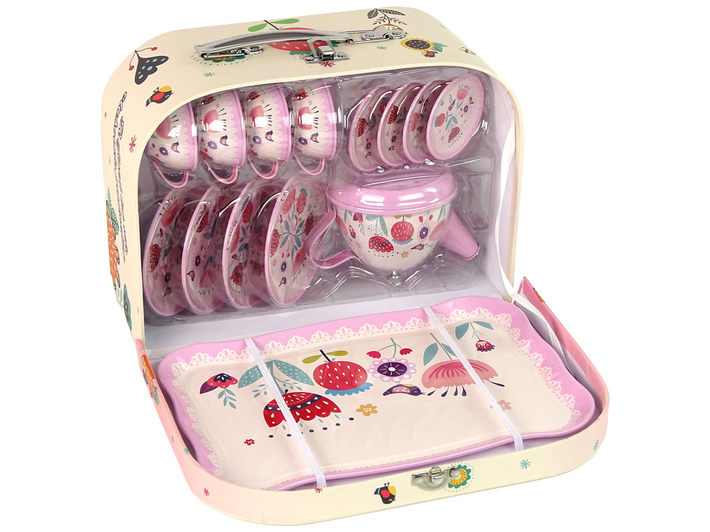 W środku kuferka znajduje się zestaw do kawy i herbaty, który składa się z małych i dużych talerzyków, czajnika do parzenia, filiżanek oraz tacki. Wszystkie elementy zestawu są w utrzymane w uroczej, różowej kolorystyce i mają ciekawe wzory, które przyciągają uwagę.