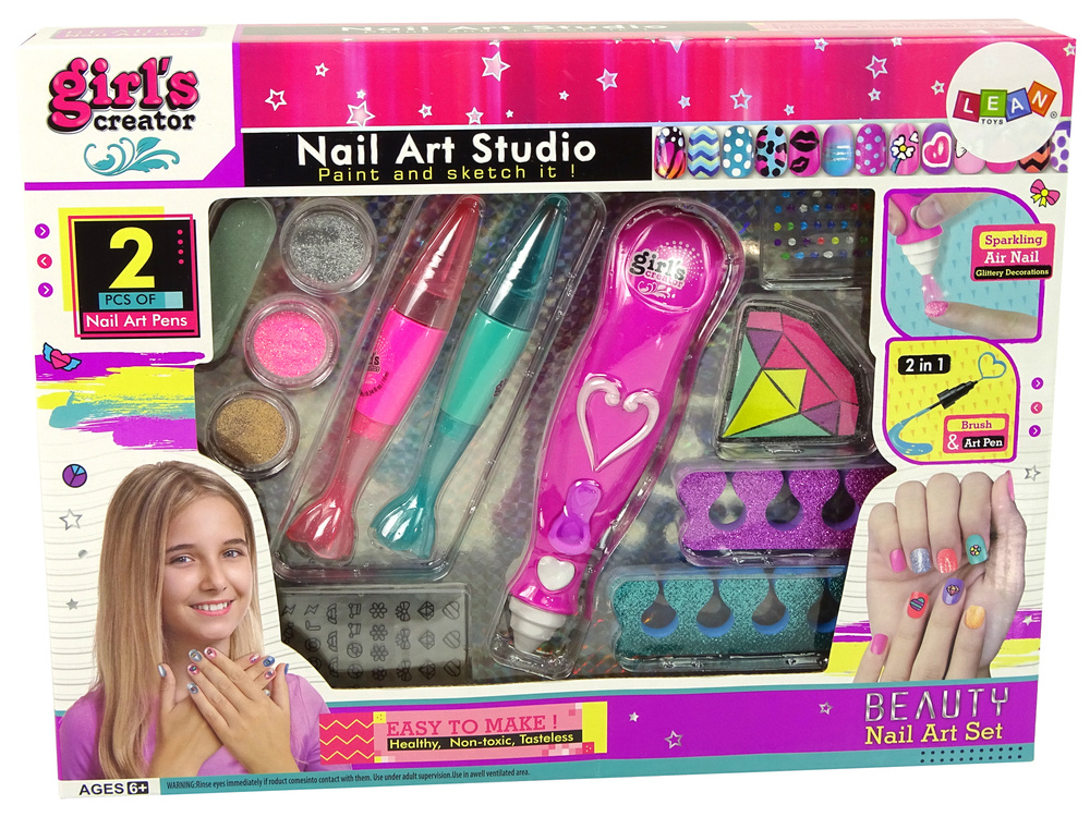 Dzięki tym akcesoriom stworzysz niebanalny wzór na swoich paznokciach, lakier bardzo szybko schnie, dlatego szybko możesz się cieszyć pięknymi paznokciami. Lakiery dołączone do zestawu wykonane są ze zdrowych, nieszkodliwych i nietoksycznych substancji, dzięki czemu nie wyrządzą żadnej szkody paznokciom dziewczynek.
